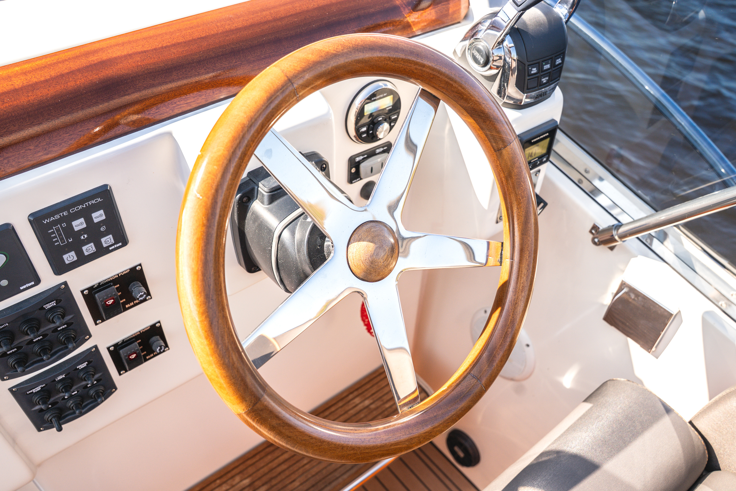 In de kuip is er gekozen voor een ruime ijskast, deze is centraal gelegen in de kuip. de handige trapjes naar de gangboorden toe dienen als opberg mogelijkheid voor de fenders. De ruime rondzit achter is geschikt voor 6 tot 8 personen, in de spiegel zit een RVS handdouche met zowel warm als koudwater en onder het zwemplateau zit een fijne zwemtrap.