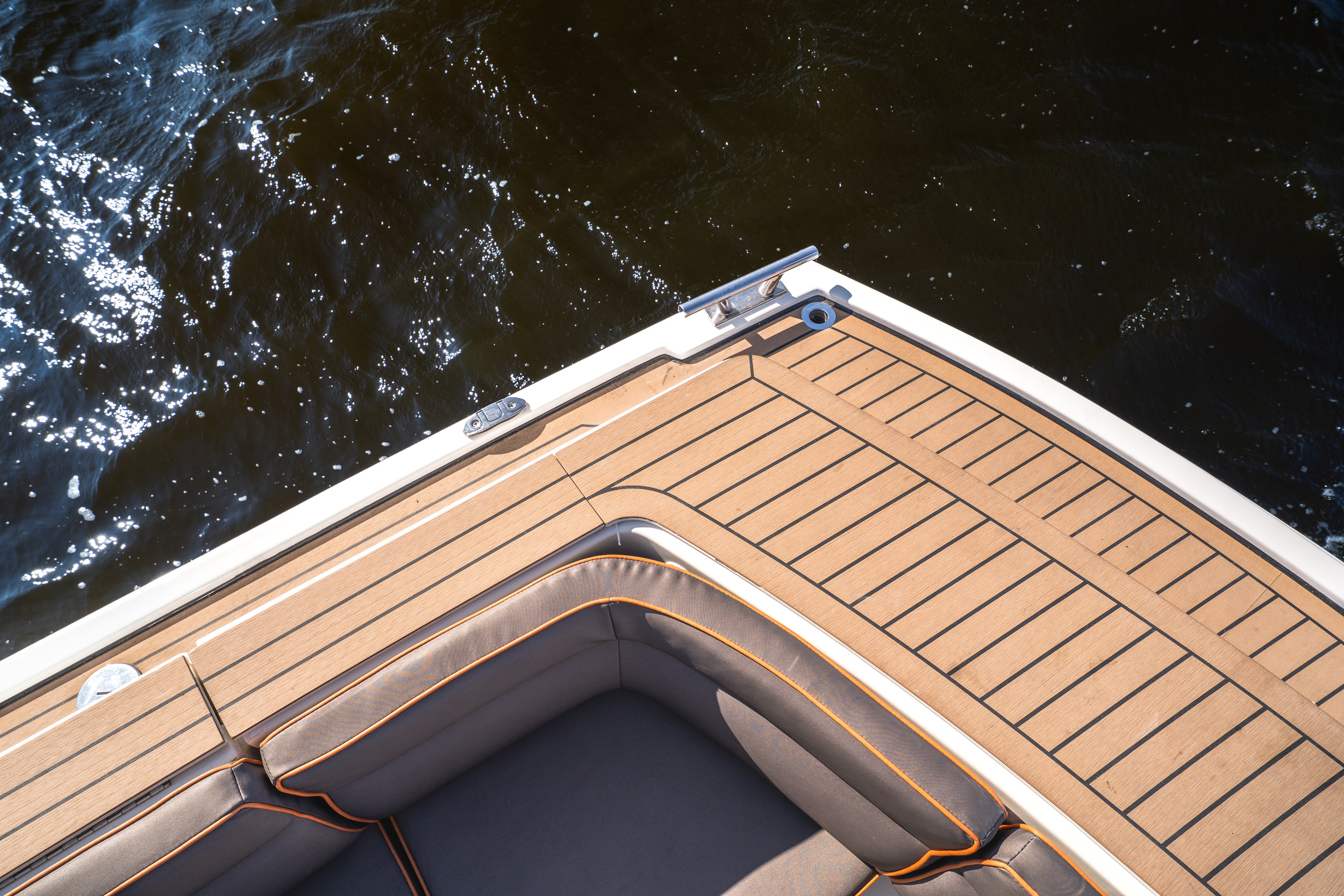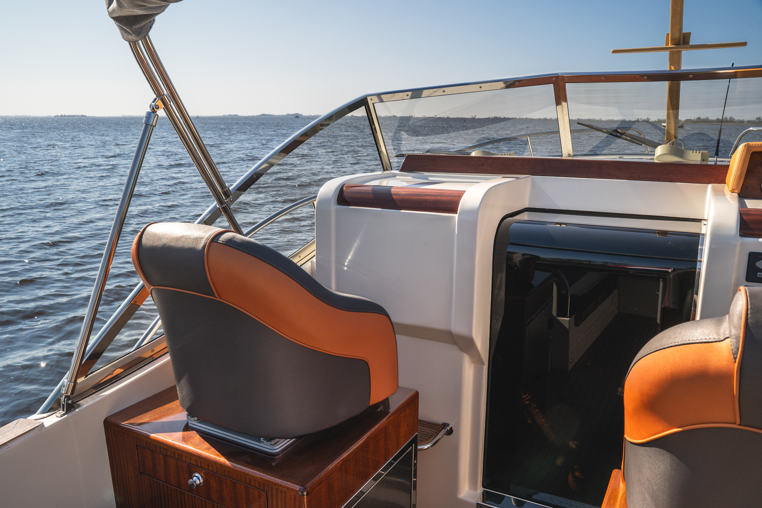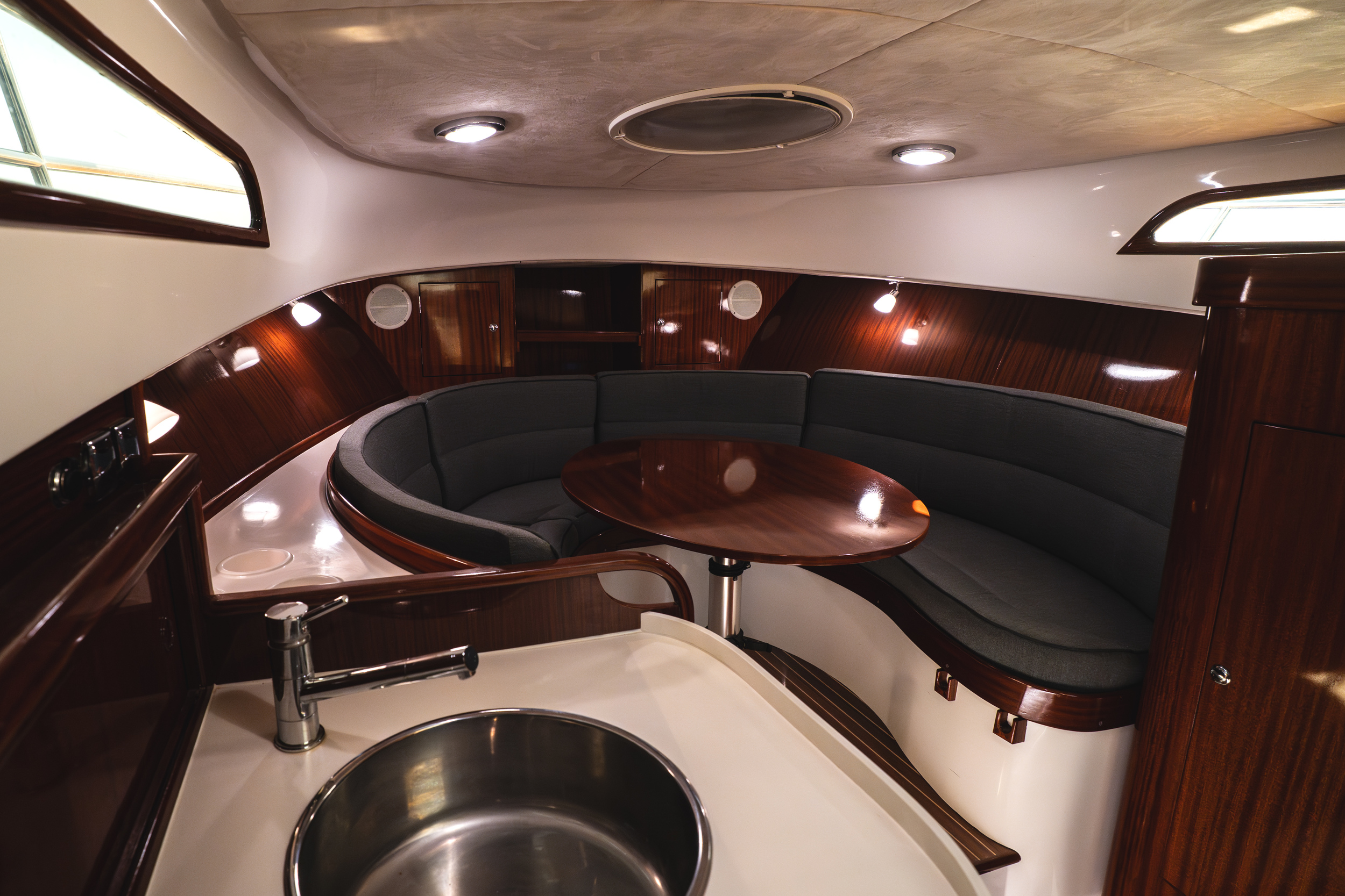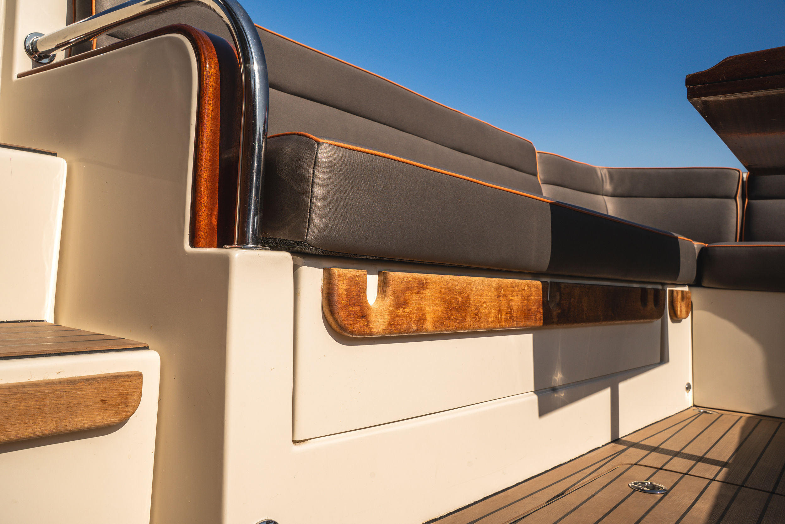 In de kuip is er gekozen voor een ruime ijskast, deze is centraal gelegen in de kuip. de handige trapjes naar de gangboorden toe dienen als opberg mogelijkheid voor de fenders. De ruime rondzit achter is geschikt voor 6 tot 8 personen, in de spiegel zit een RVS handdouche met zowel warm als koudwater en onder het zwemplateau zit een fijne zwemtrap.