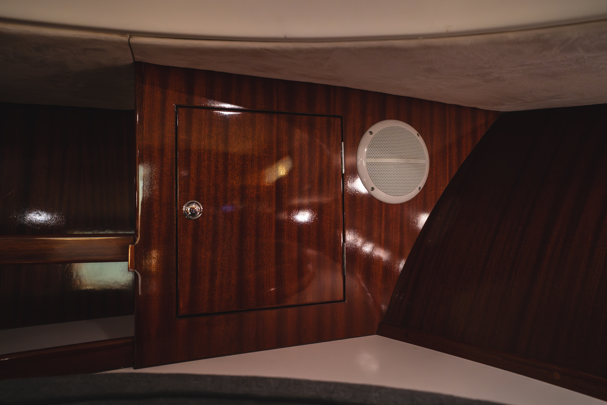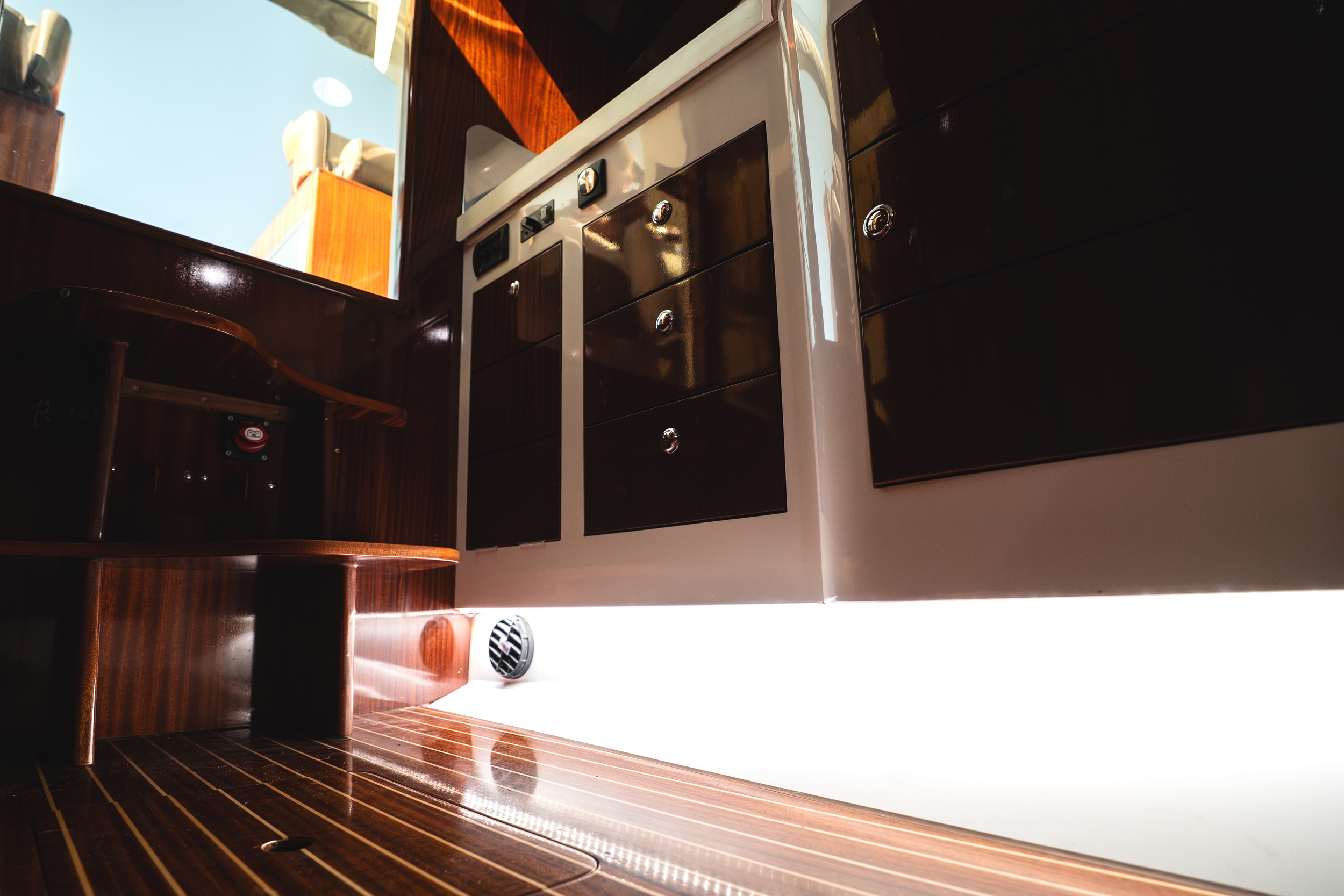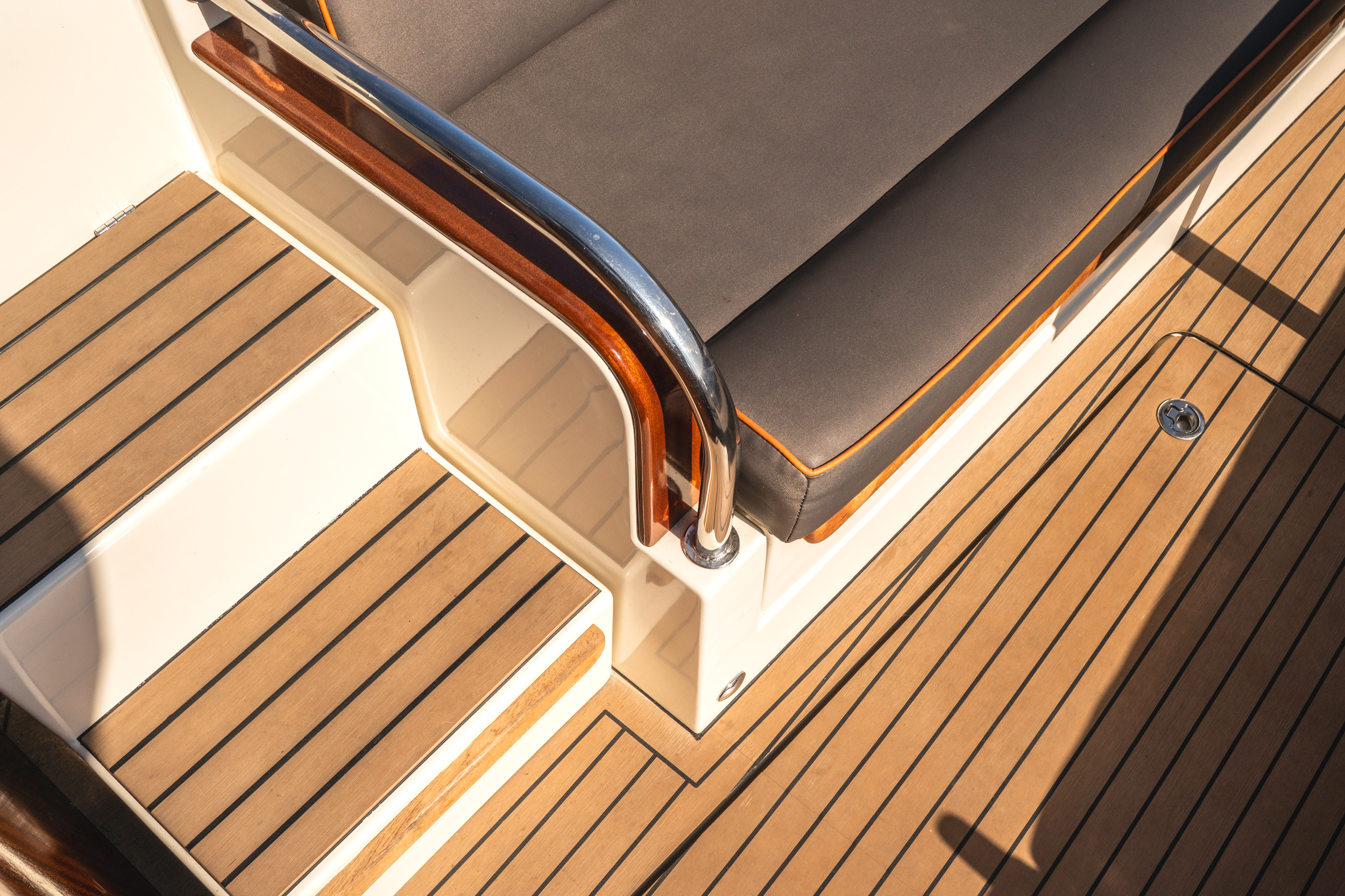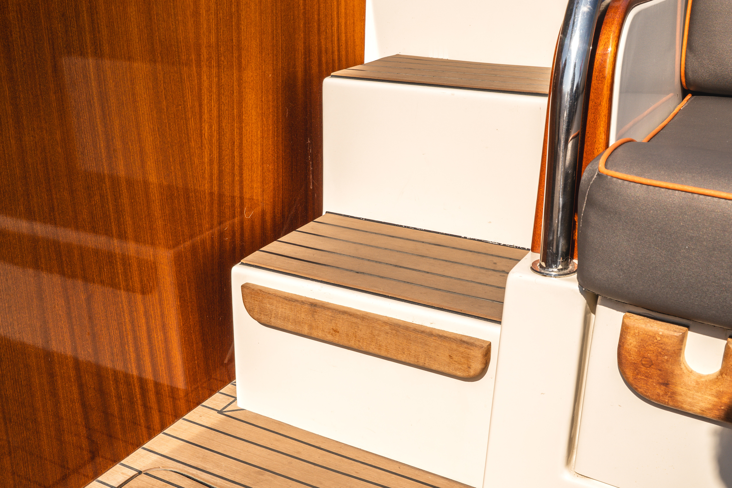 In de kuip is er gekozen voor een ruime ijskast, deze is centraal gelegen in de kuip. de handige trapjes naar de gangboorden toe dienen als opberg mogelijkheid voor de fenders. De ruime rondzit achter is geschikt voor 6 tot 8 personen, in de spiegel zit een RVS handdouche met zowel warm als koudwater en onder het zwemplateau zit een fijne zwemtrap.