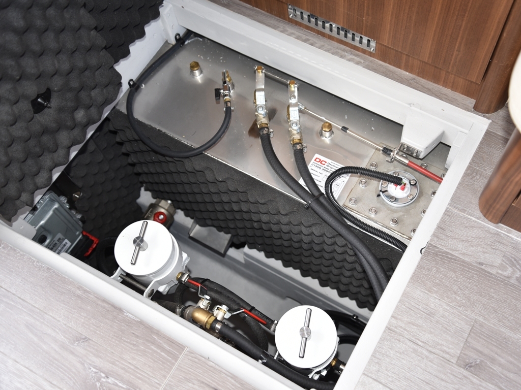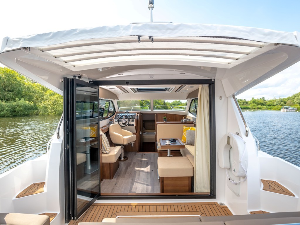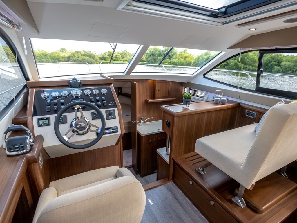De open kuip, welke voorzien is comfortabele zitbank en complete tent rondom, is gemakkelijk toegankelijk door de spiegeldeur. De salon/kombuis en stuurstand zijn op gelijk niveau en praktisch ingedeeld, het grote schuifdak en de panoramische raampartij rondom zorgt voor veel lichtinval. Het voorschip is ingedeeld met kombuis, sanitaire ruimte en eigenaarshut. De kombuis is van alle gemakken voorzien. De sanitaire ruimte is ingedeeld met elektrisch toilet en was/douchegelegenheid. De ruime eigenaarshut is met vrijstaand bed en voldoende hang- /legkasten. De algehele ruimte is praktisch ingedeeld en voorzien van voldoende bergruimte.