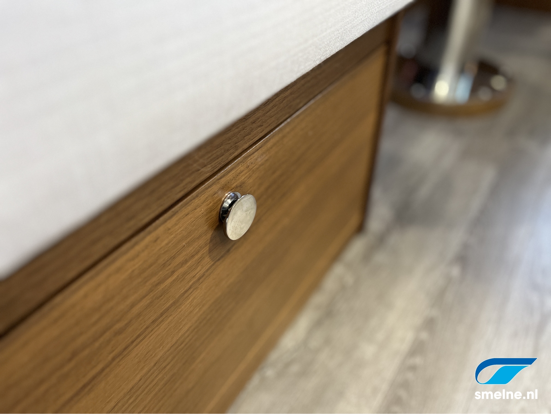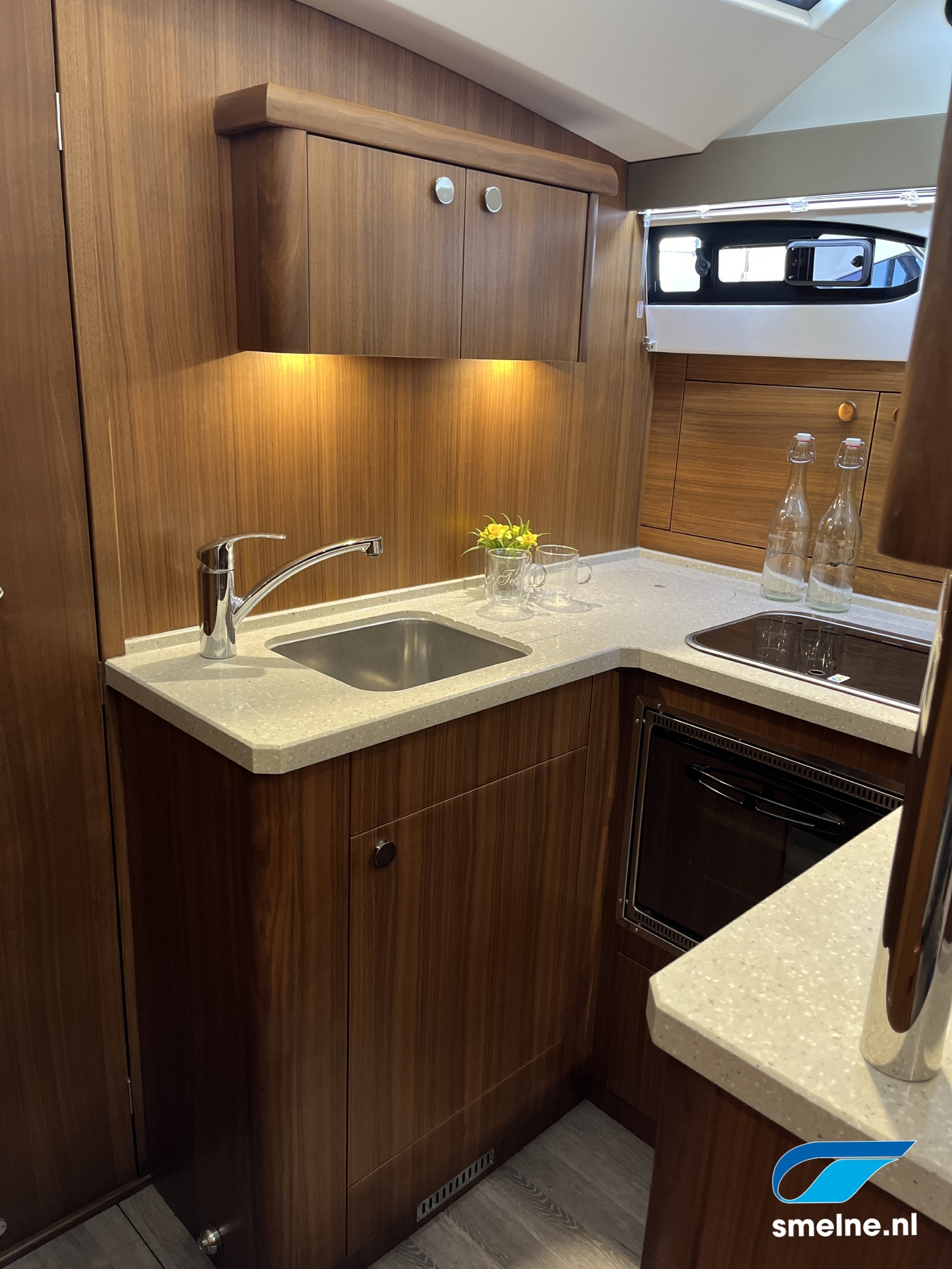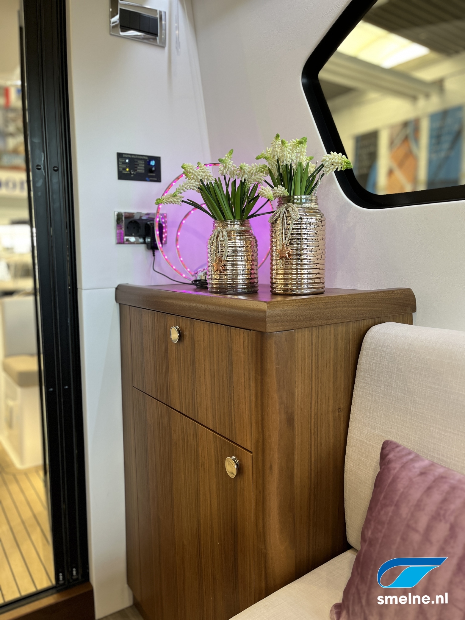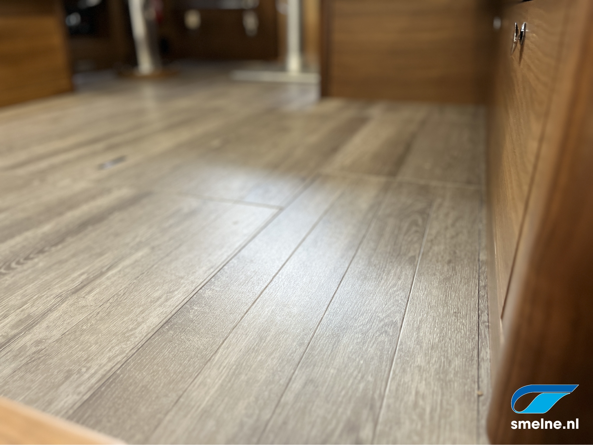 AccommodatieMateriaal, kleuren: Walnoot interieur afgewerkt met massief lijstwerk, lichte wandpanelen, moderne bekleding en PVC vloer in salon/kombuis