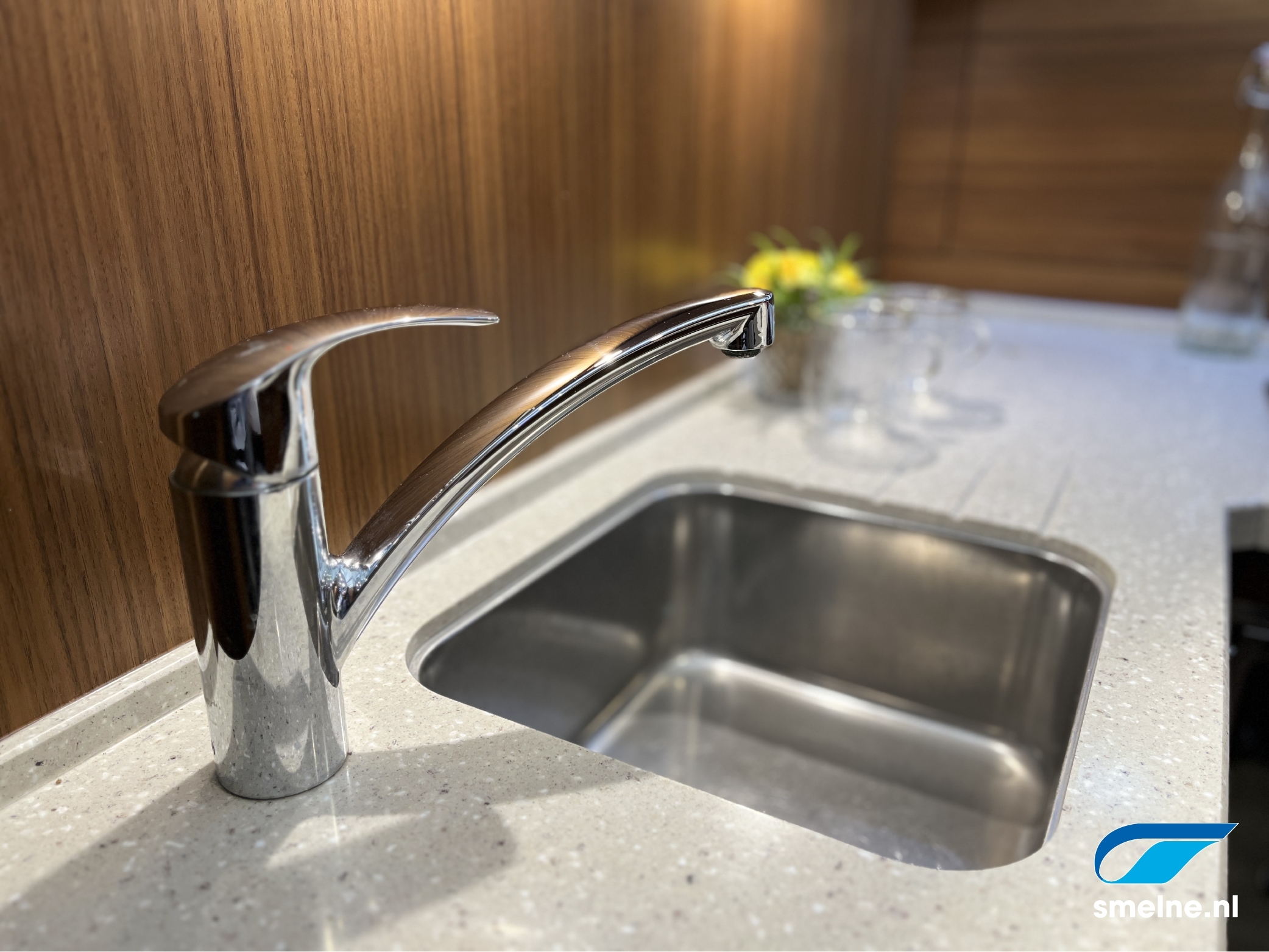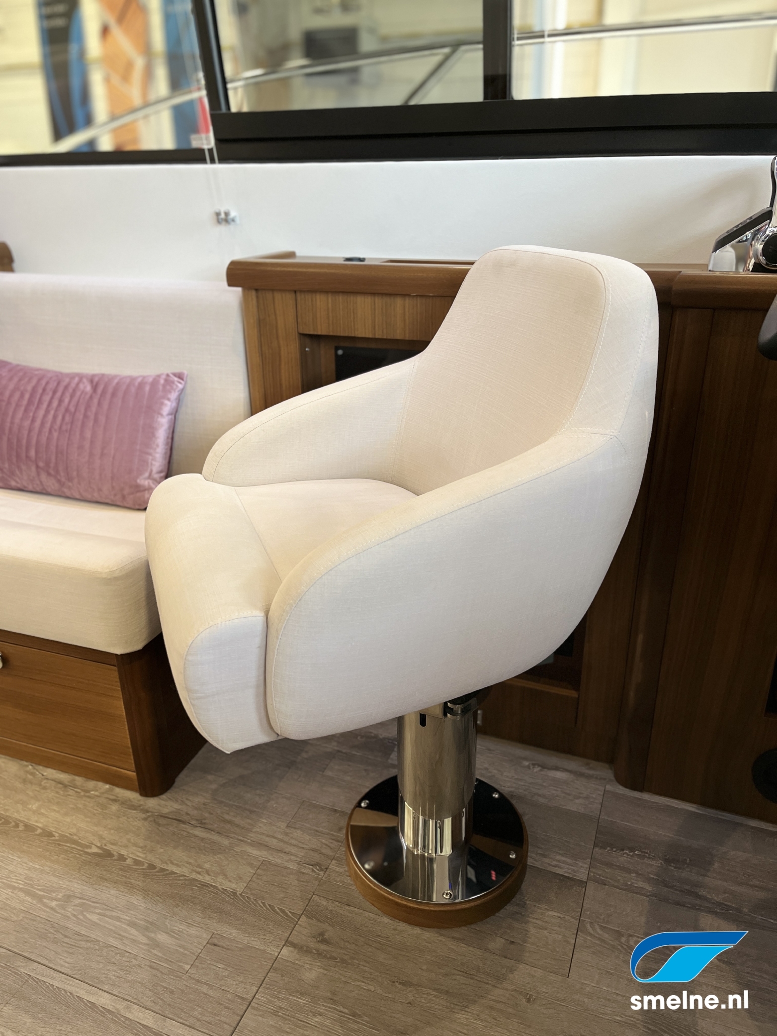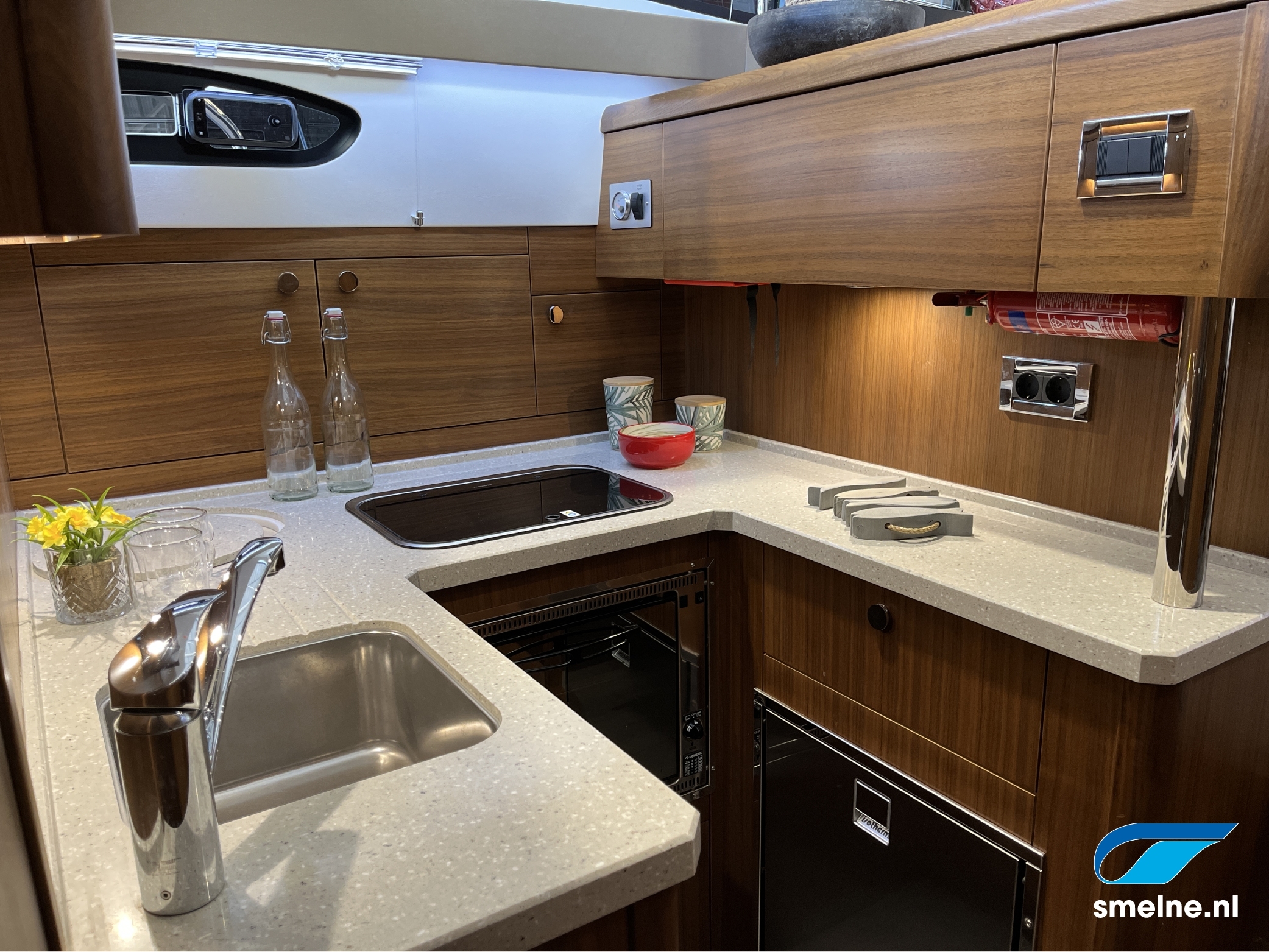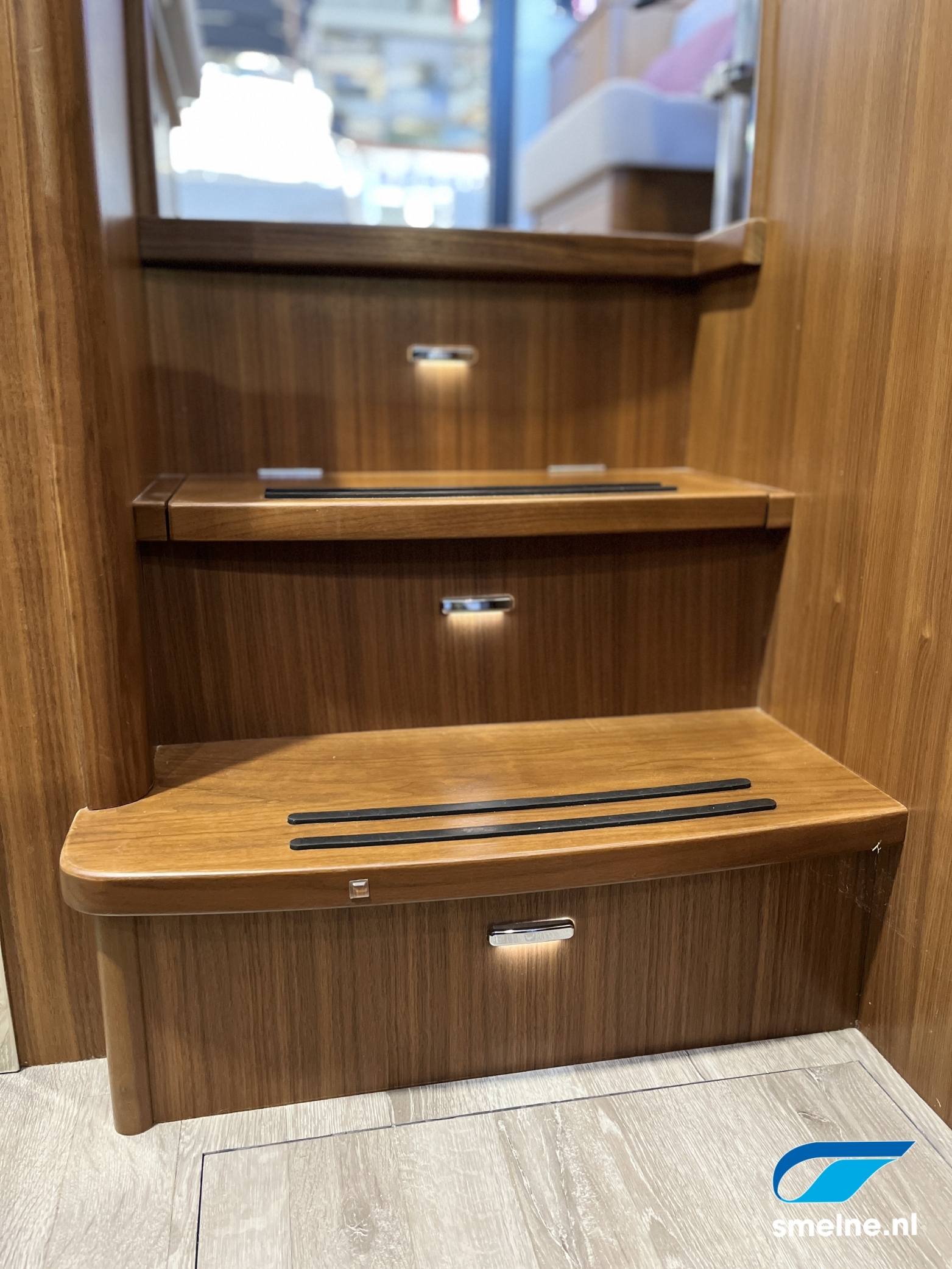 AccommodatieMateriaal, kleuren: Walnoot interieur afgewerkt met massief lijstwerk, lichte wandpanelen, moderne bekleding en PVC vloer in salon/kombuis