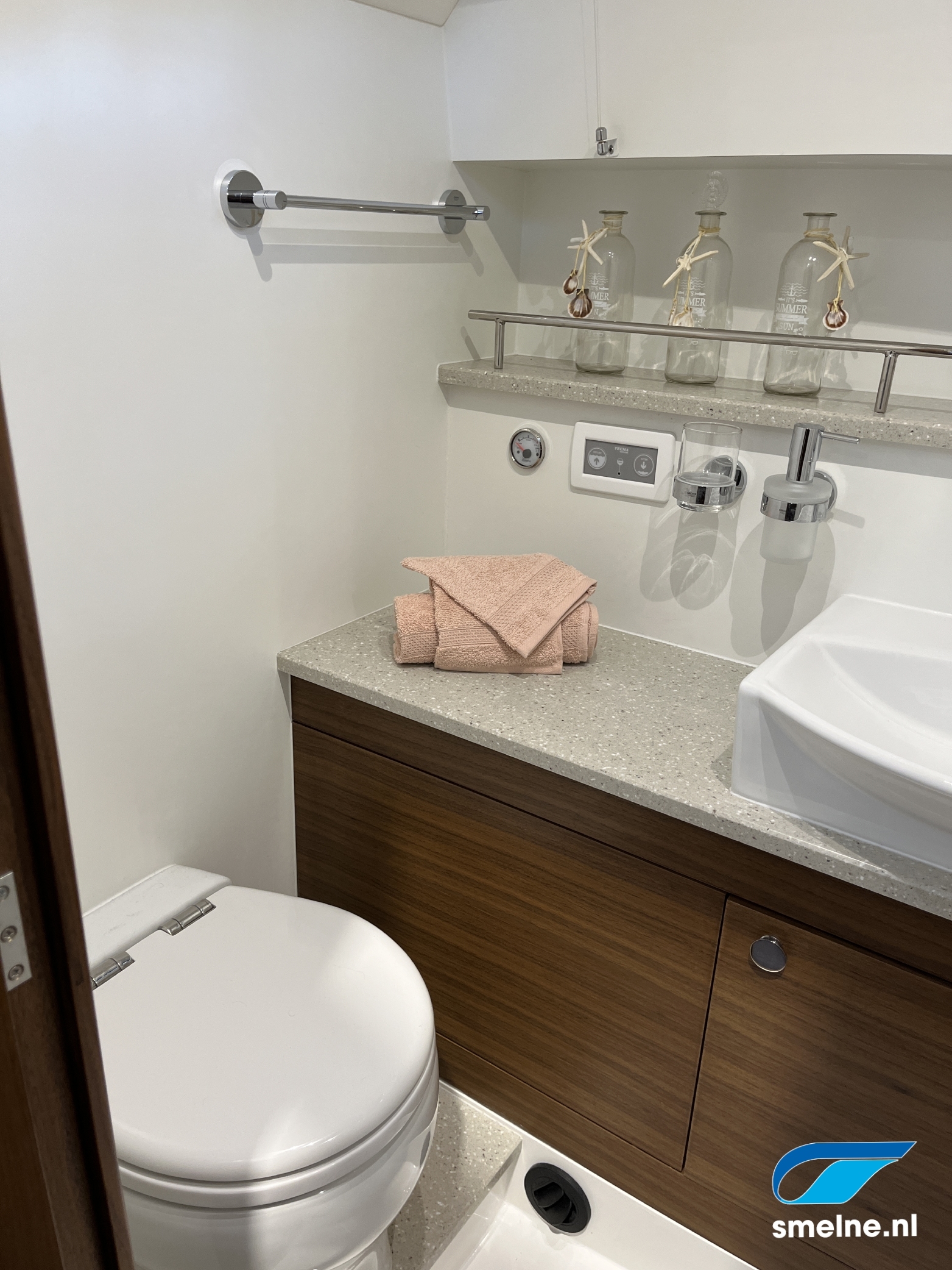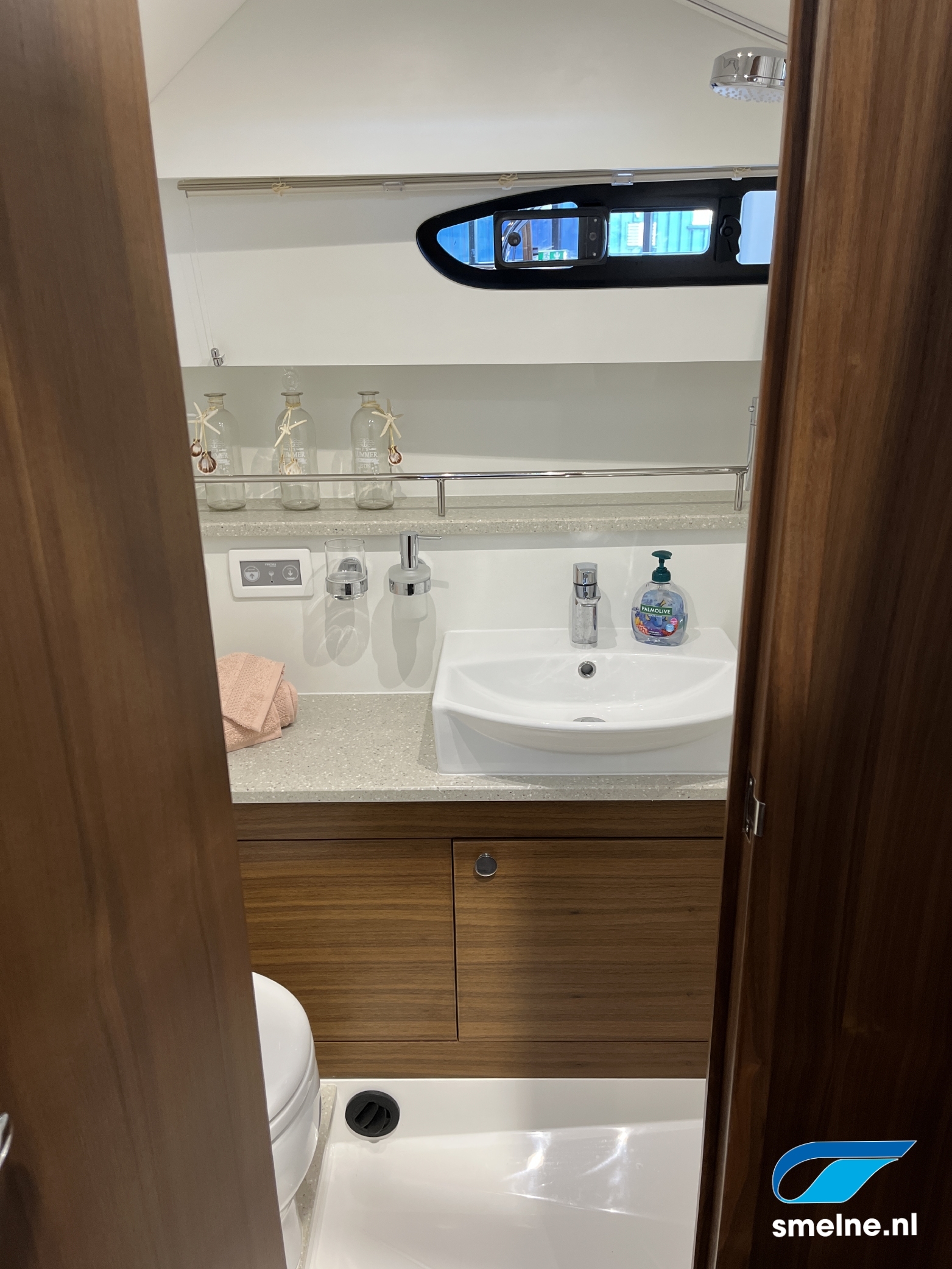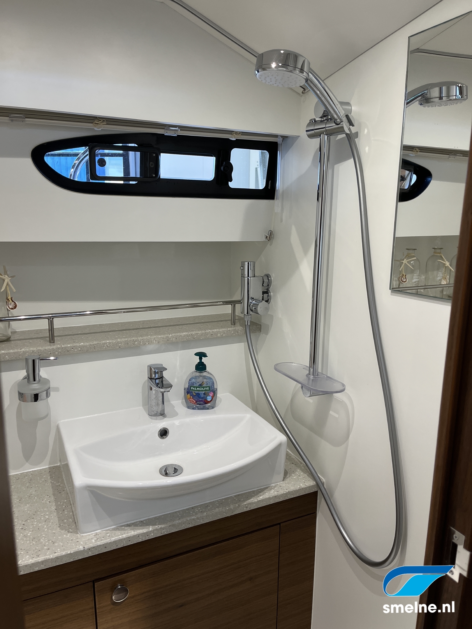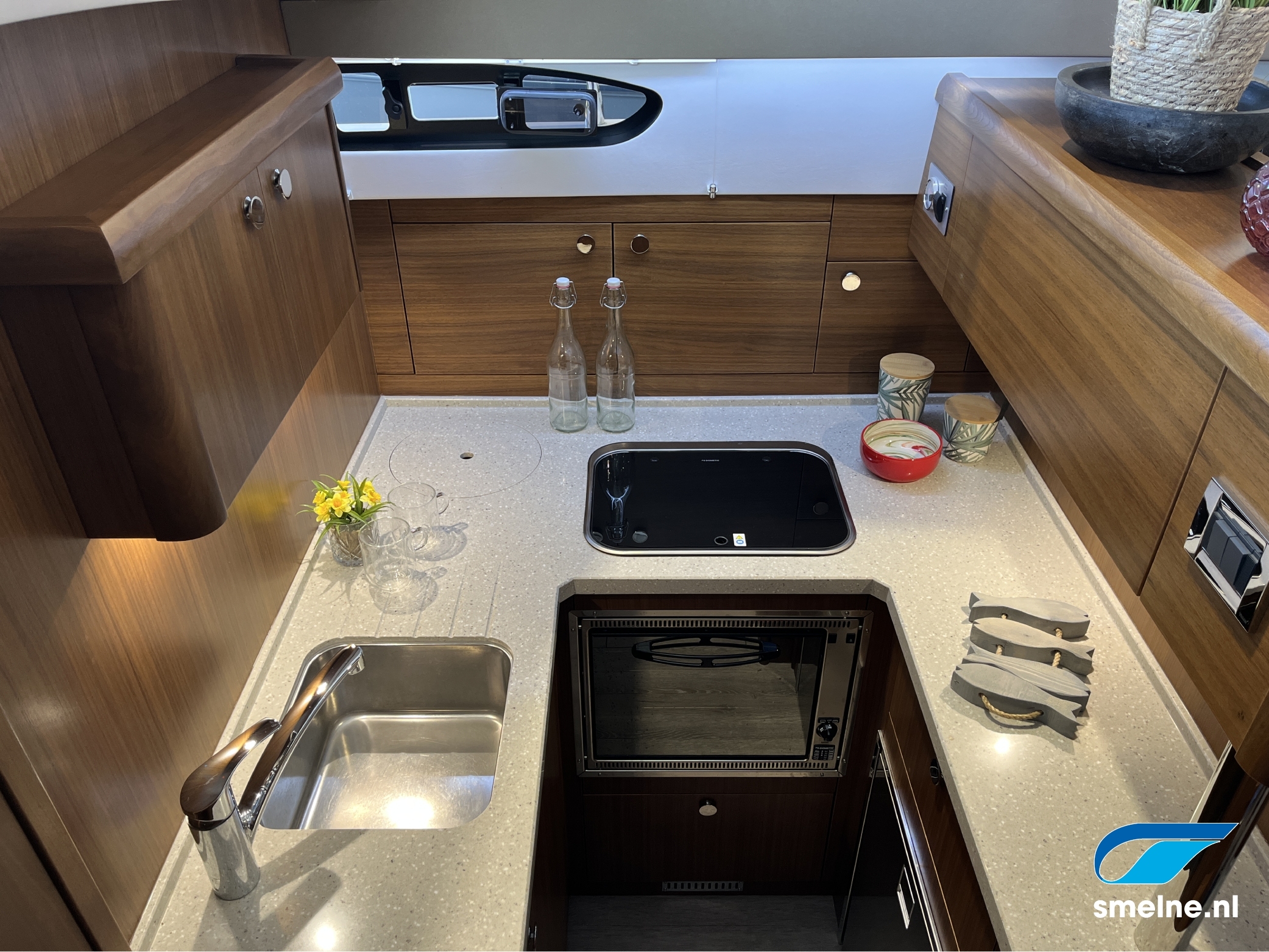 In het voorschip is een compleet uitgeruste keuken, de eigenaarshut met vrijstaand dubbel bed en sanitaire ruimte met elektrisch toilet en was-/douchemogelijkheid.