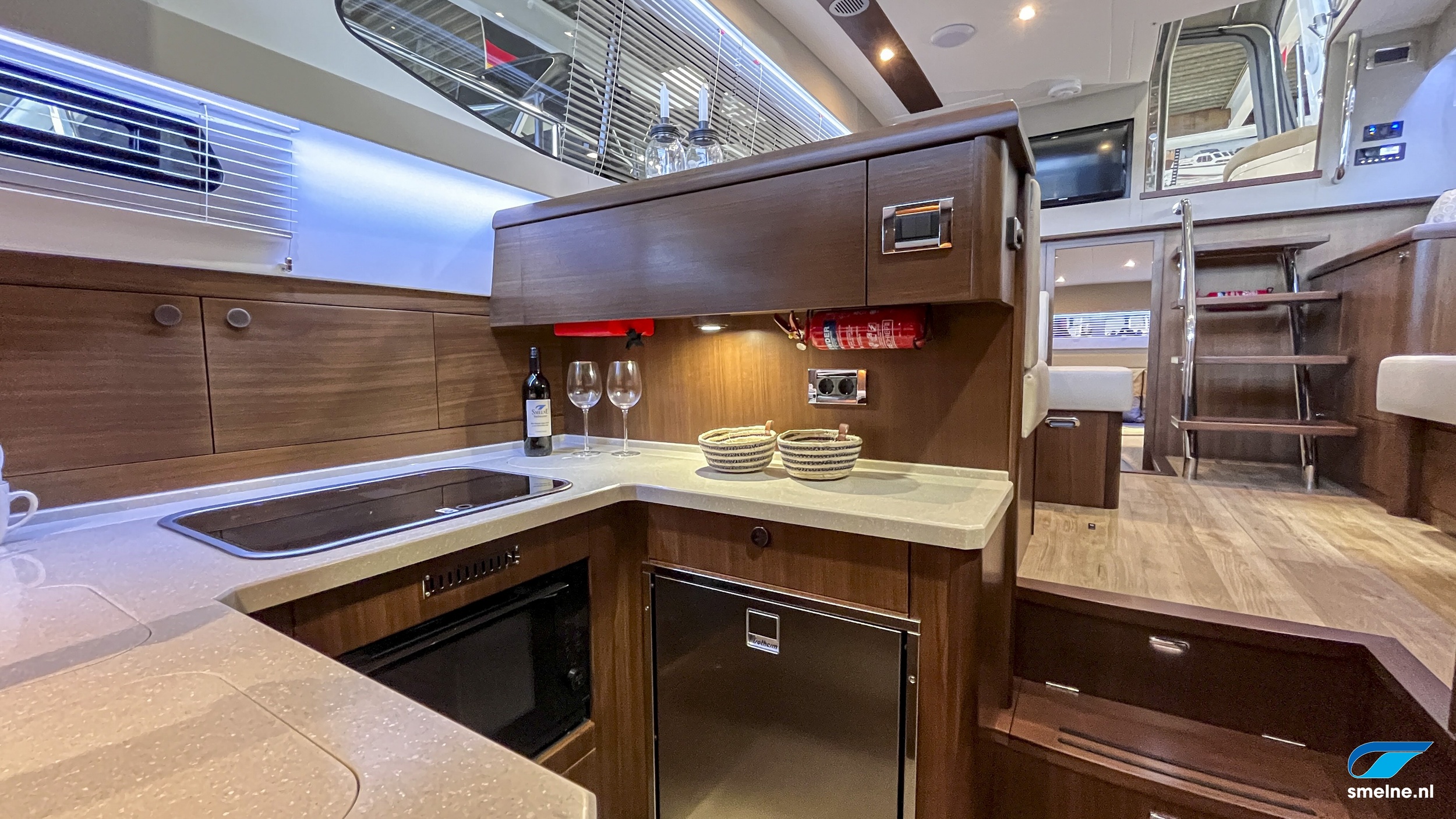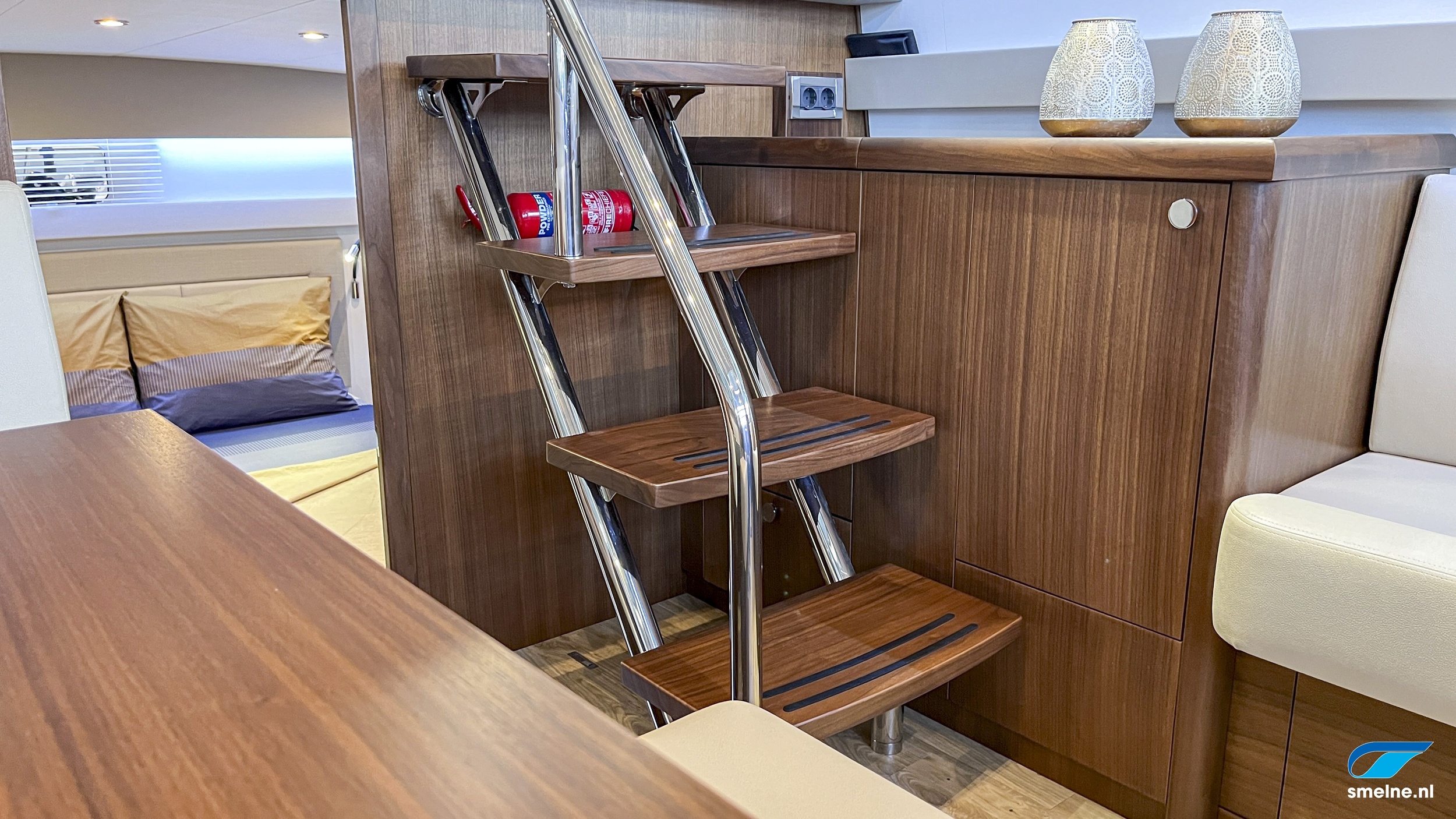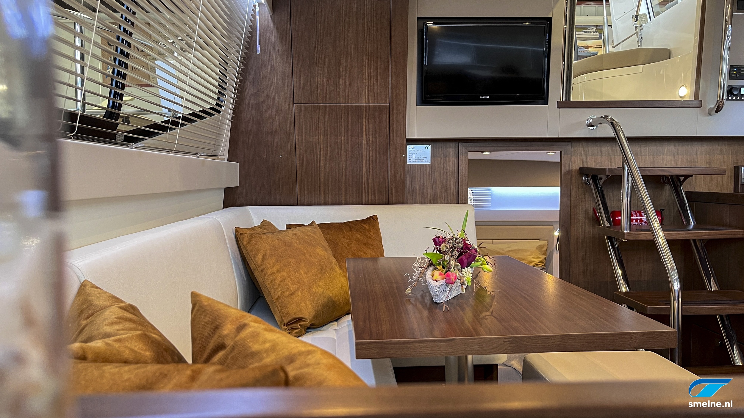 Naast de al zeer rijk uitgevoerde specificatielijst zijn de volgende items en opties het extra benoemen waard; prachtig walnoot interieur met massief lijstwerk wat afgewerkt is met panelen in moderne kleurstelling en voorzien van luxe lederen bekleding, jaloezieën door gehele vaartuig, HIMACS werkbladen in kombuis en sanitaire ruimtes, dubbele RVS spoelbak en geïntegreerde afvalemmer in keuken, Bosch wasmachine, groot dakluik met verduistering en insecten hor voor optimale ventilatie in salon, luxe LED verlichting door gehele vaartuig, oriëntatie verlichting in spiegeltrap, coming-/leaving boat verlichting op achterdek, stuurstandbank met swingback rugleuning, elektronische motorbediening, ontwasemingsunctie op windscherm, USB + 12V aansluiting bij stuurstand, extra luidsprekers in instrumentenbeugel, RVS fenderhouders (voor 6 fenders) op zwemplateau, etc. etc.