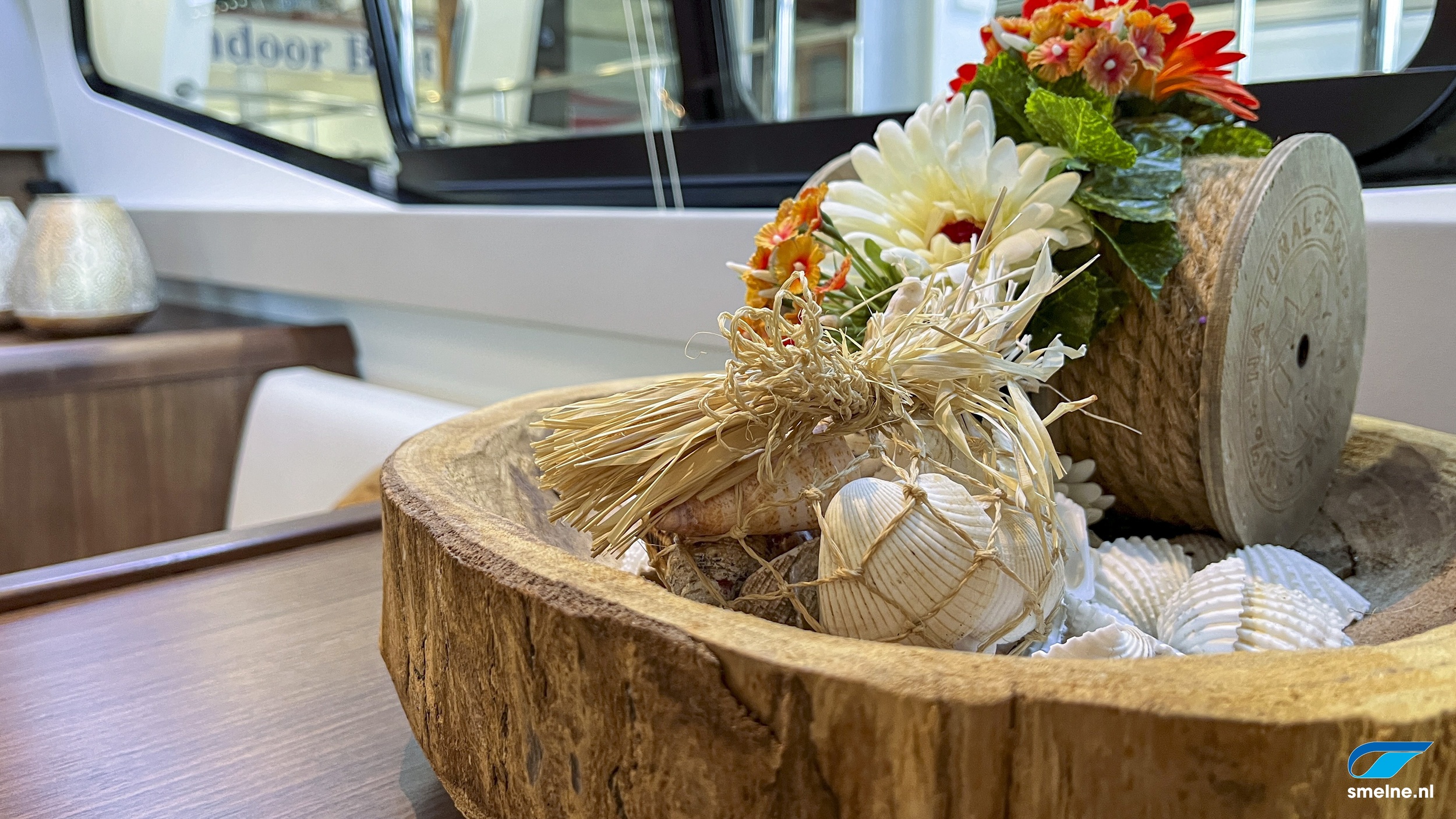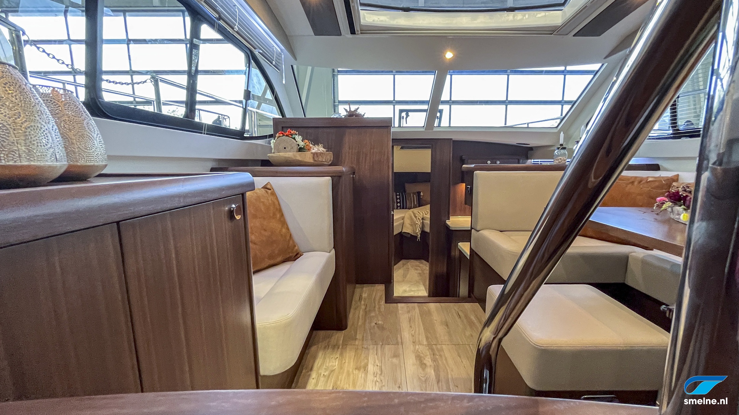 AccommodatieMateriaal, kleuren: Walnoot interieur, afgewerkt met massief lijstwerk en panelen in lichte kleurstelling, PVC vloer in salon en kombuis