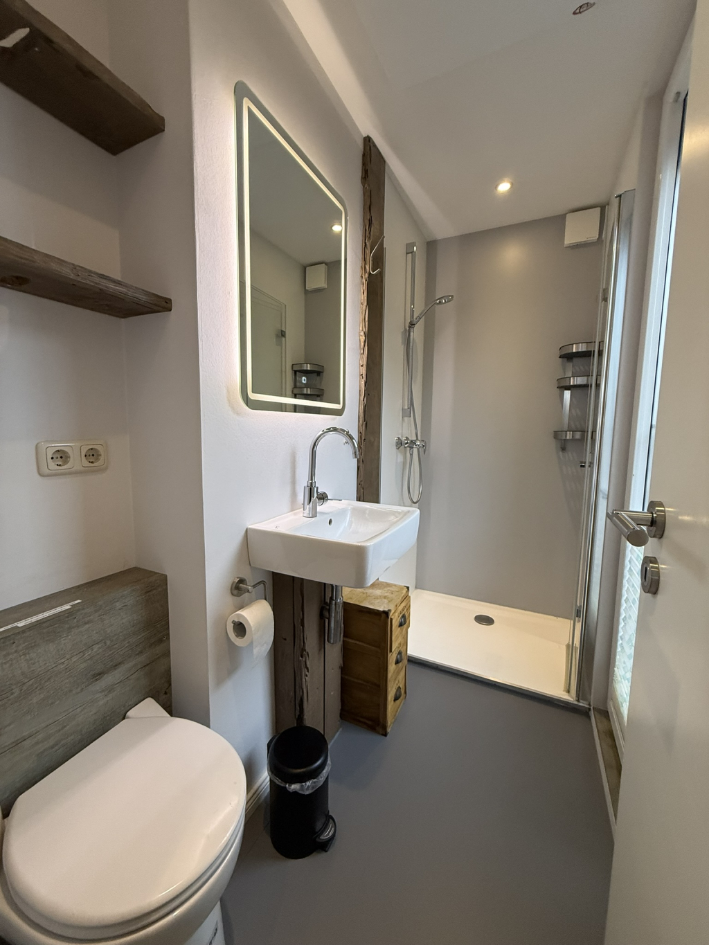 Beneden naast de trap zit de deur naar de badkamer. Hier vinden we een douchebak achter glazen douchescherm met automatische afzuiginstallatie, een wasbak en elektr. wc. Ook deze ruimte is voorzien van een draai/kiepraam met zonwering/verduistering, een IR plafondverwarming en afwerking met decoratie.