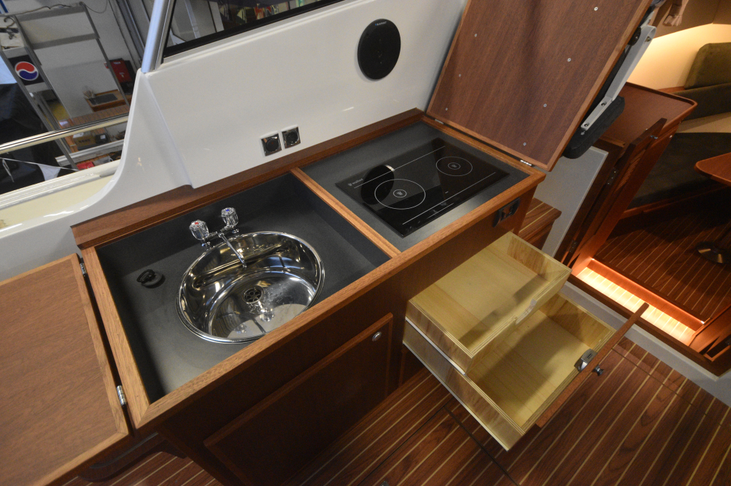 Motor ingebouwd in een geluidsdichte kist. Geruisarm varen.
