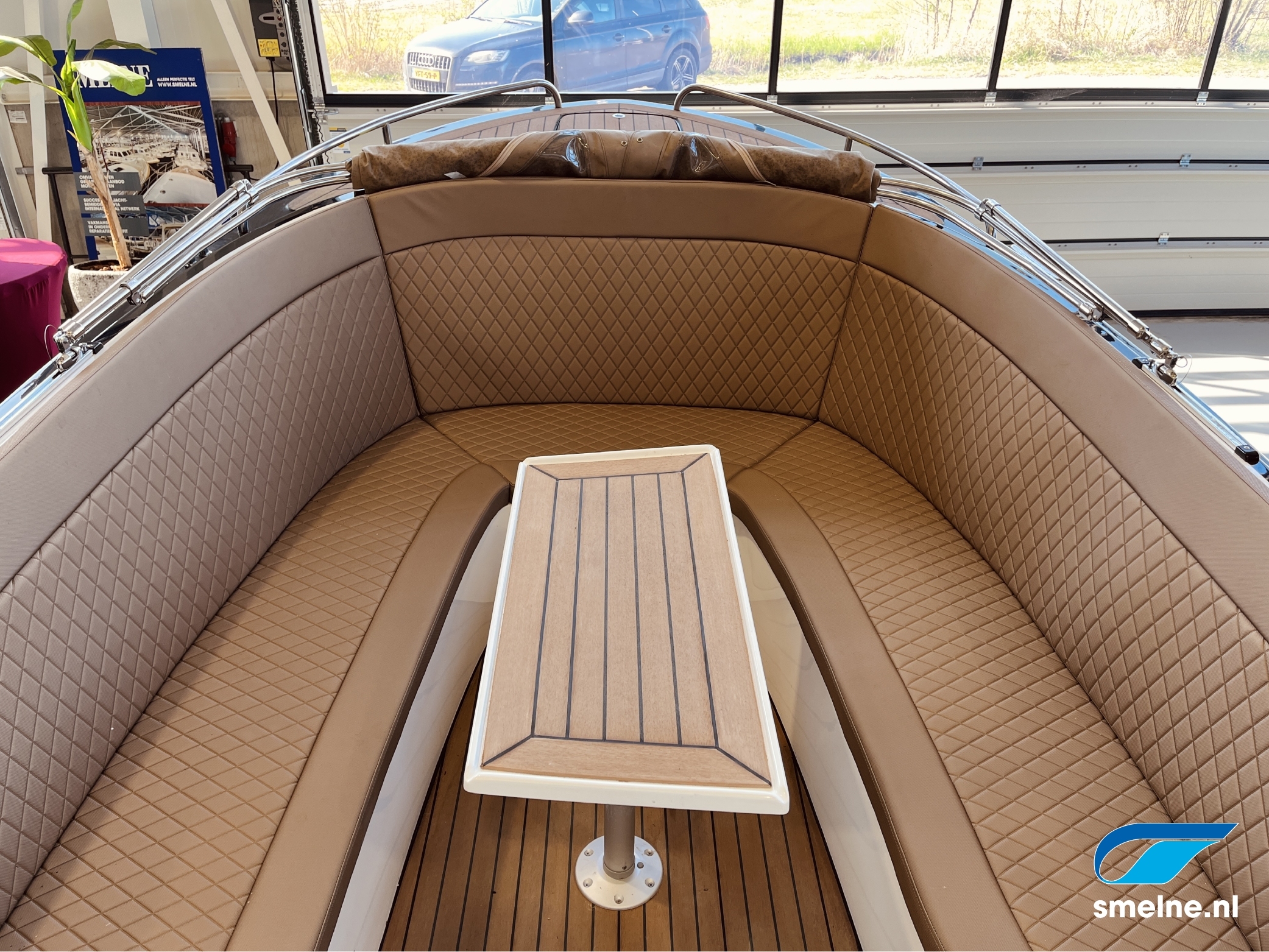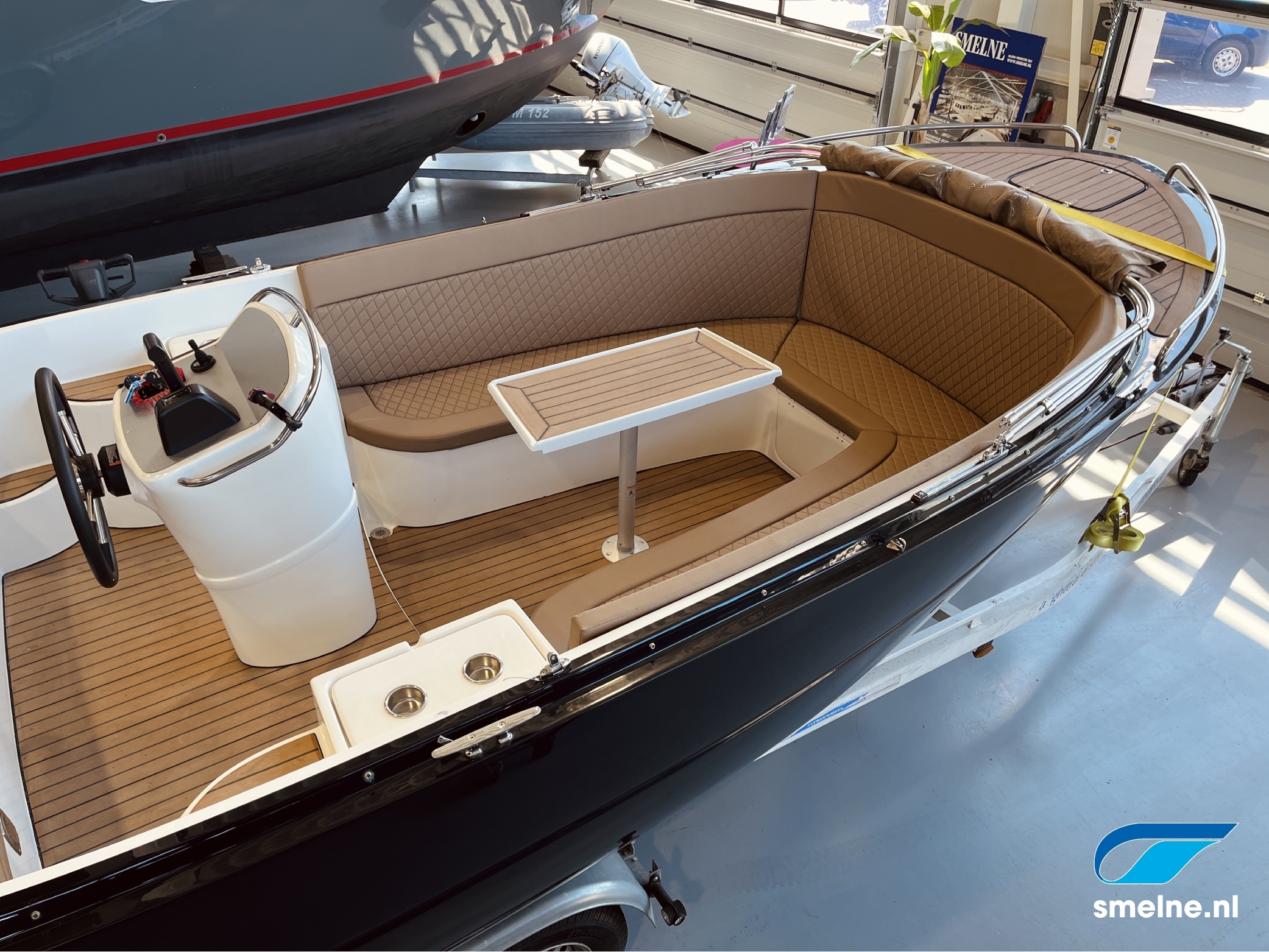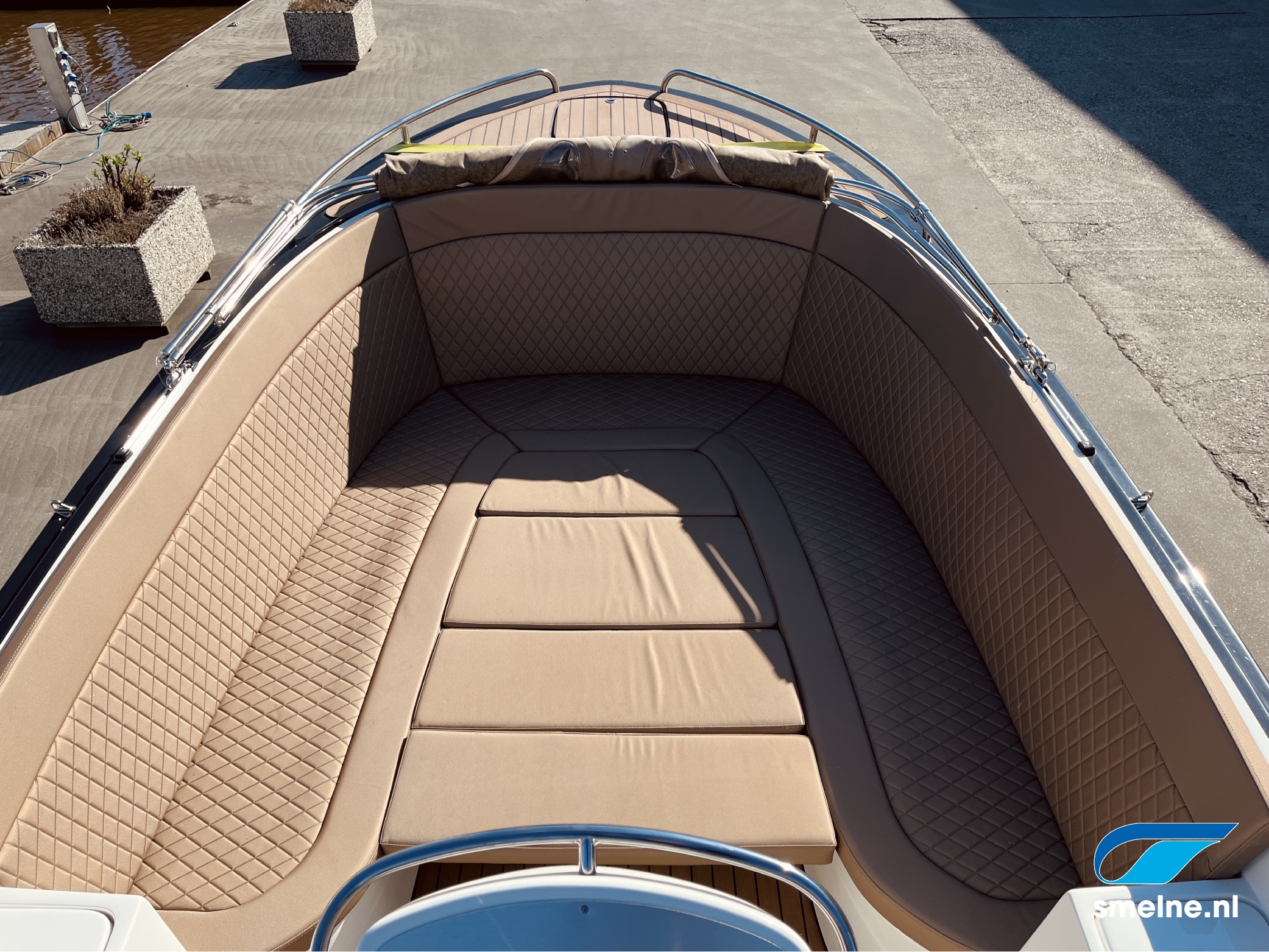 Dankzij de tenderspiegel met geïntegreerde opstapjes en instapmogelijkheden in de kuip is deze sloep vanuit alle posities gemakkelijk toegankelijk. Achterin de open kuip is een overzichtelijke stuurconsole met comfortabele bank gesitueerd. Voorin de sloep is eveneens een comfortabele U-bank met kuiptafel. Voor diegenen die willen genieten van de zon, is er in een handomdraai een zonnebed te creëren waarop u heerlijk kunt ontspannen. Toch liever een schaduwplekje met een heerlijk briesje? Ook dat is realiseerbaar onder de luxe buiskap, op degelijk RVS frame.