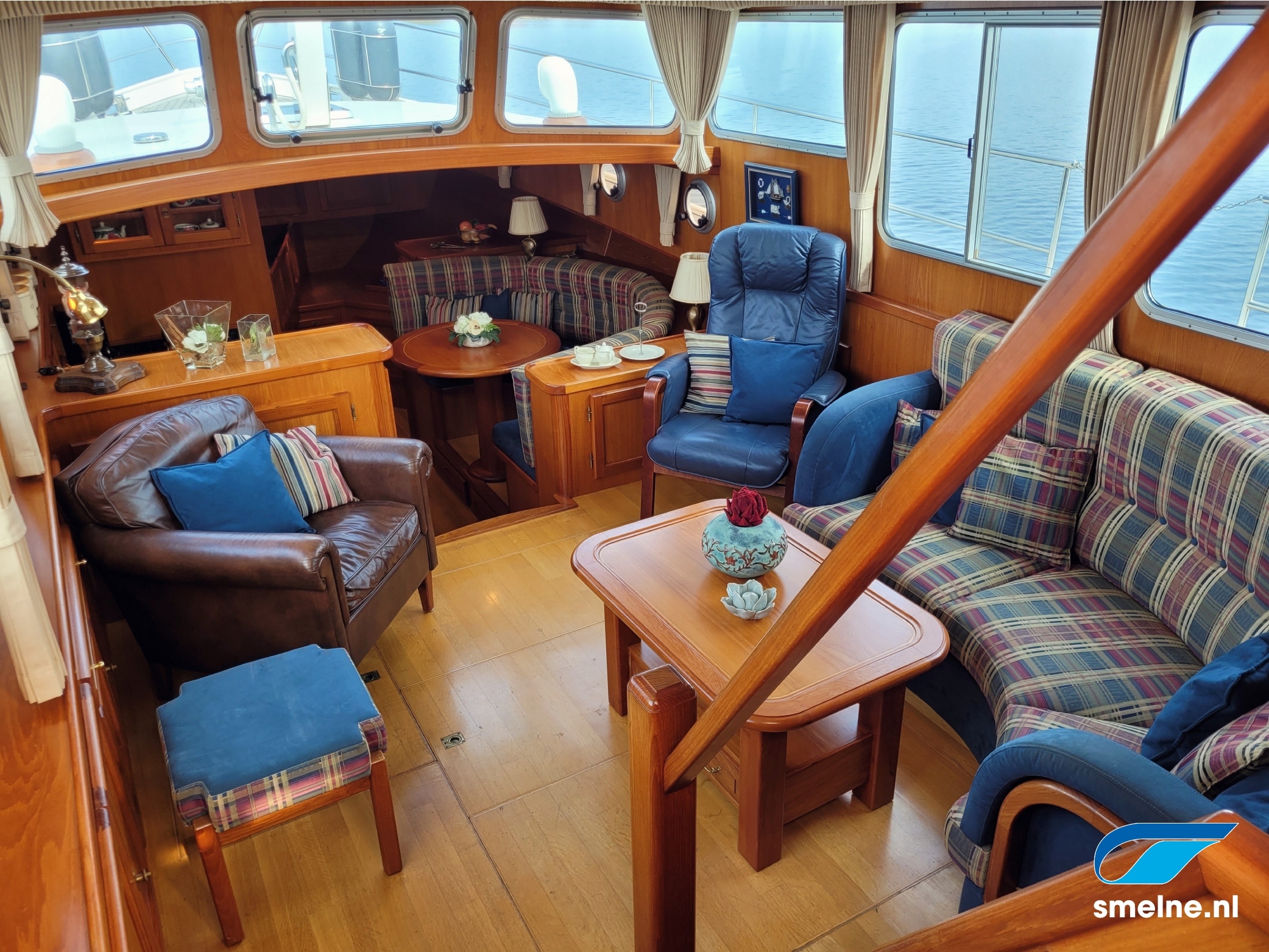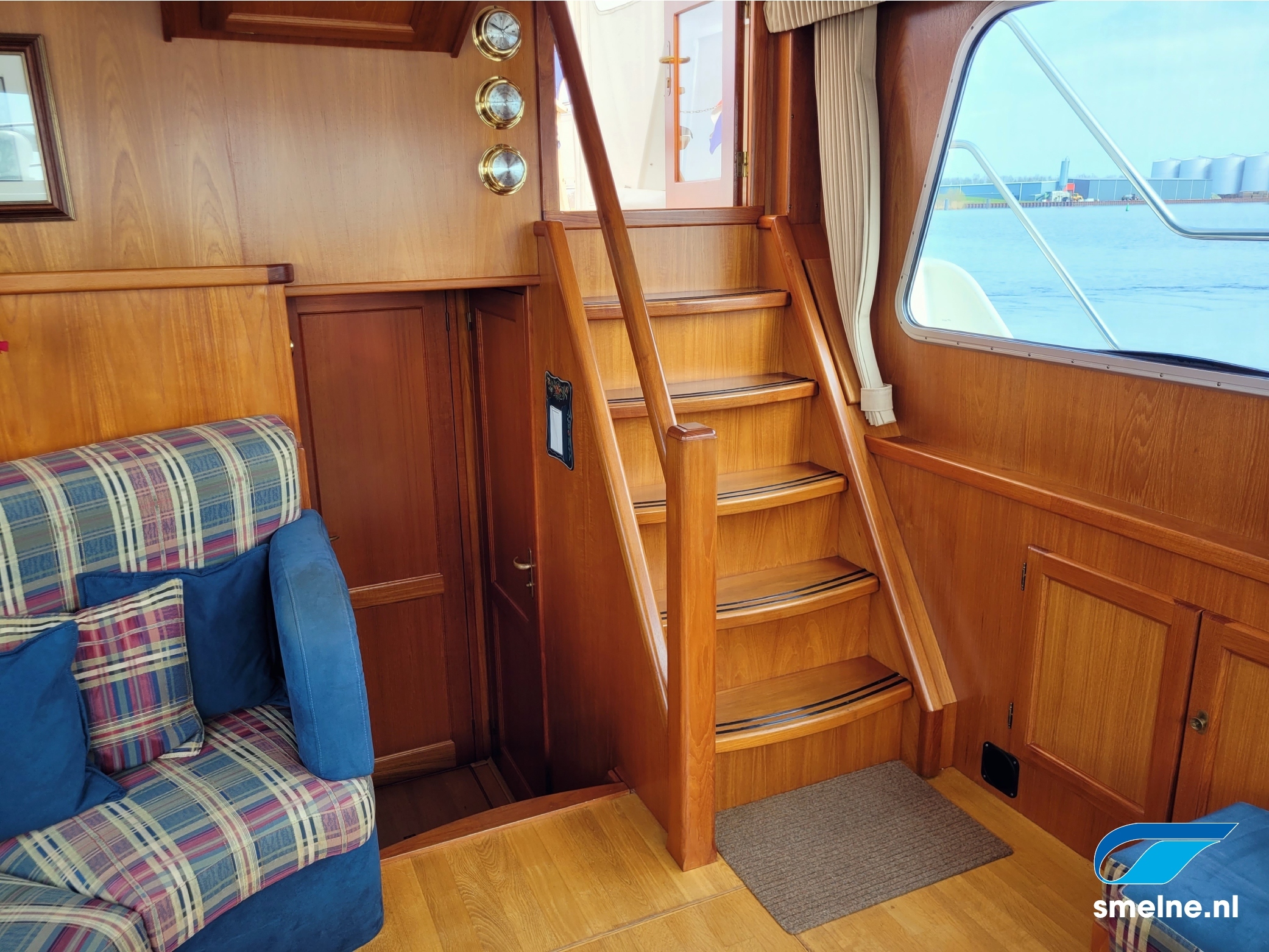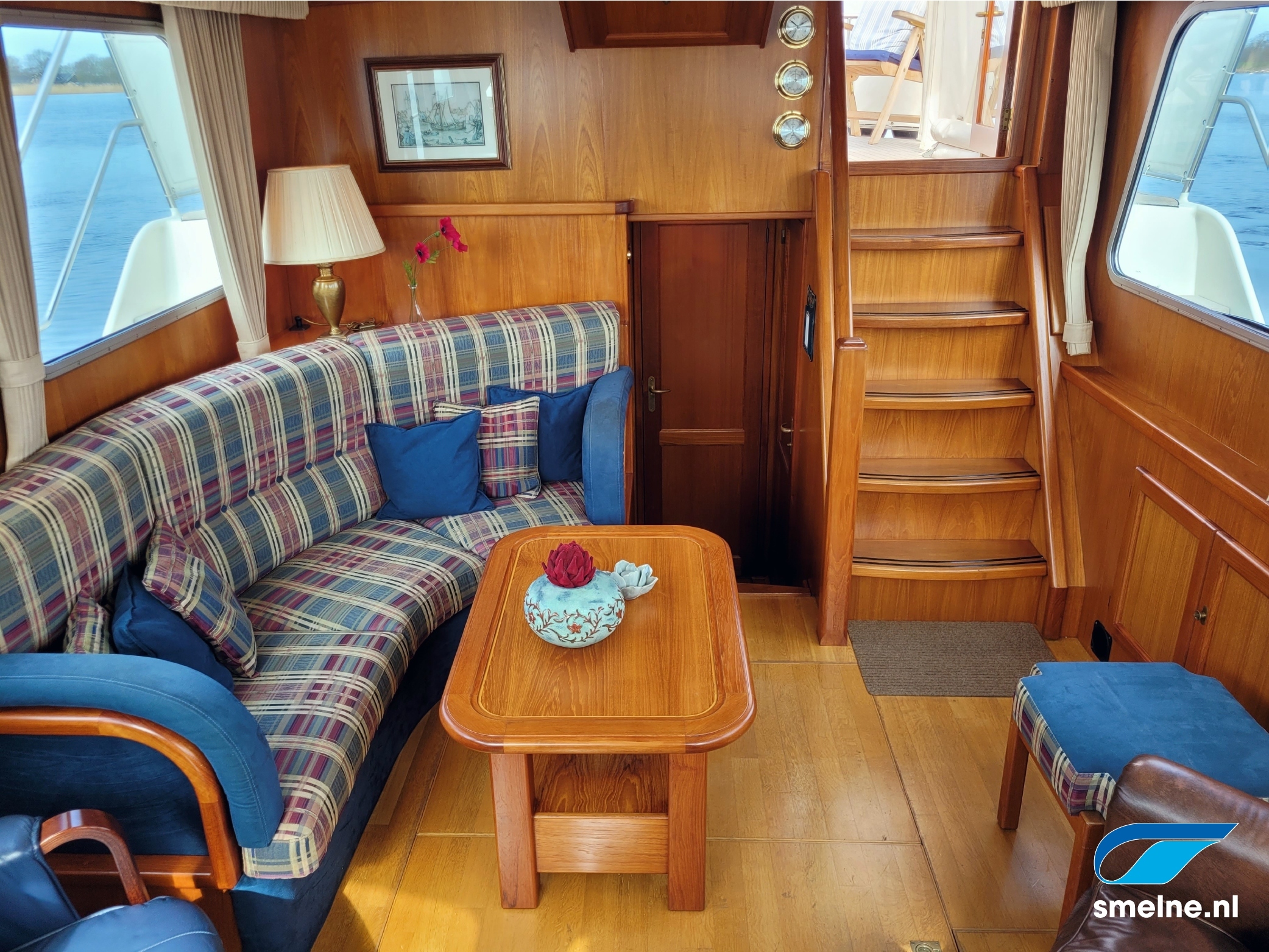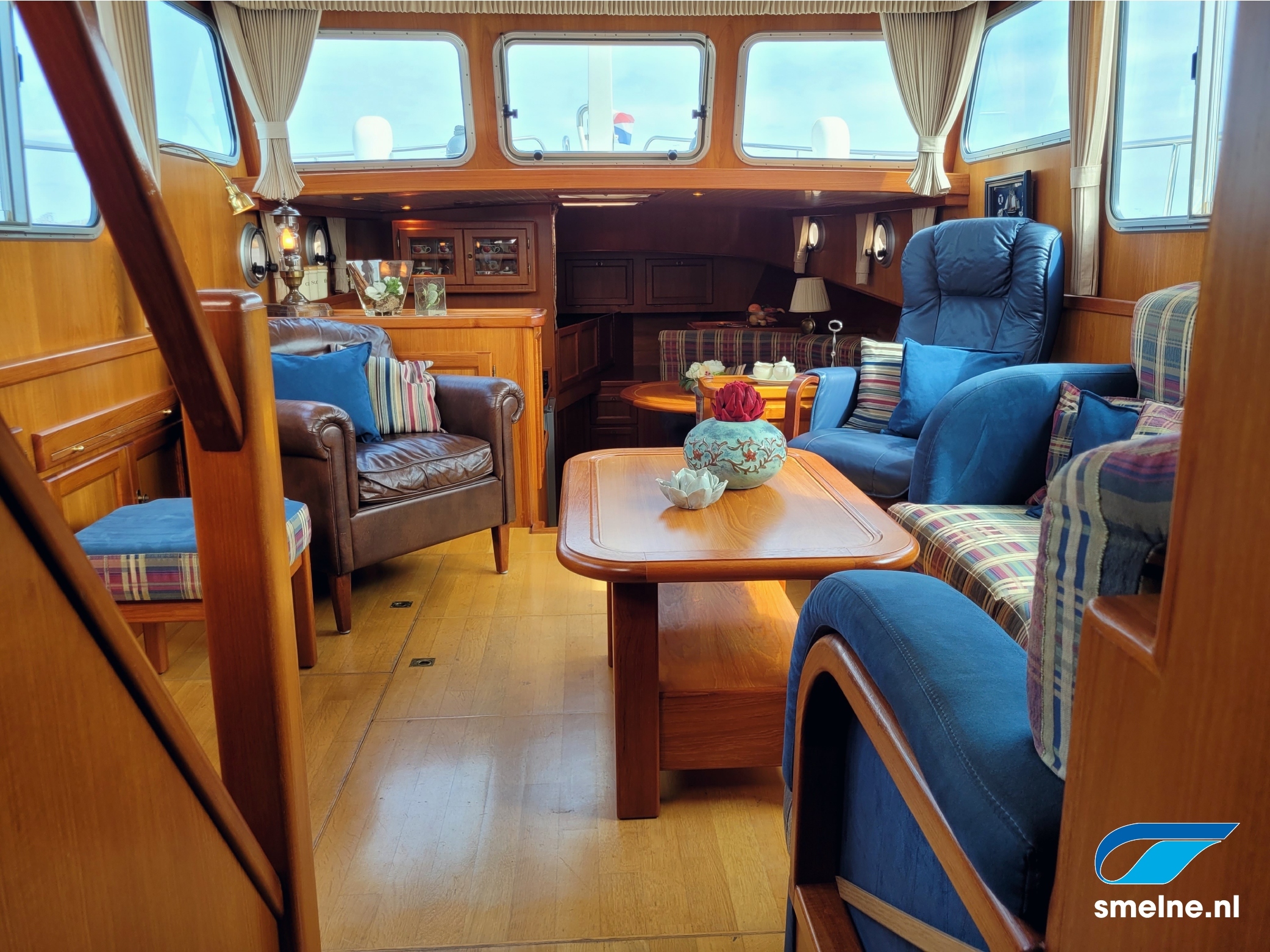 Het ruime achterdek is vanuit de brede gangboorden gemakkelijk toegankelijk en voorzien van vaste dekbank, midscheepse stuurstand met goed uitzicht rondom en achteringang naar de salon. De salon is ingedeeld met een kastenwand met daartegenover een hoek-zitbank zodat er ook nog ruimte is voor twee comfortabele fauteuils. In open verbinding met de salon is de kombuis die ingedeeld is met keuken met daartegenover een halfronde dinette. In het voorschip is een dubbel bed en kastruimte. In het achterschip is een ruime toiletruimte, de royale eigenaarshut met doucheruimte ensuite en veel kastruimte.
