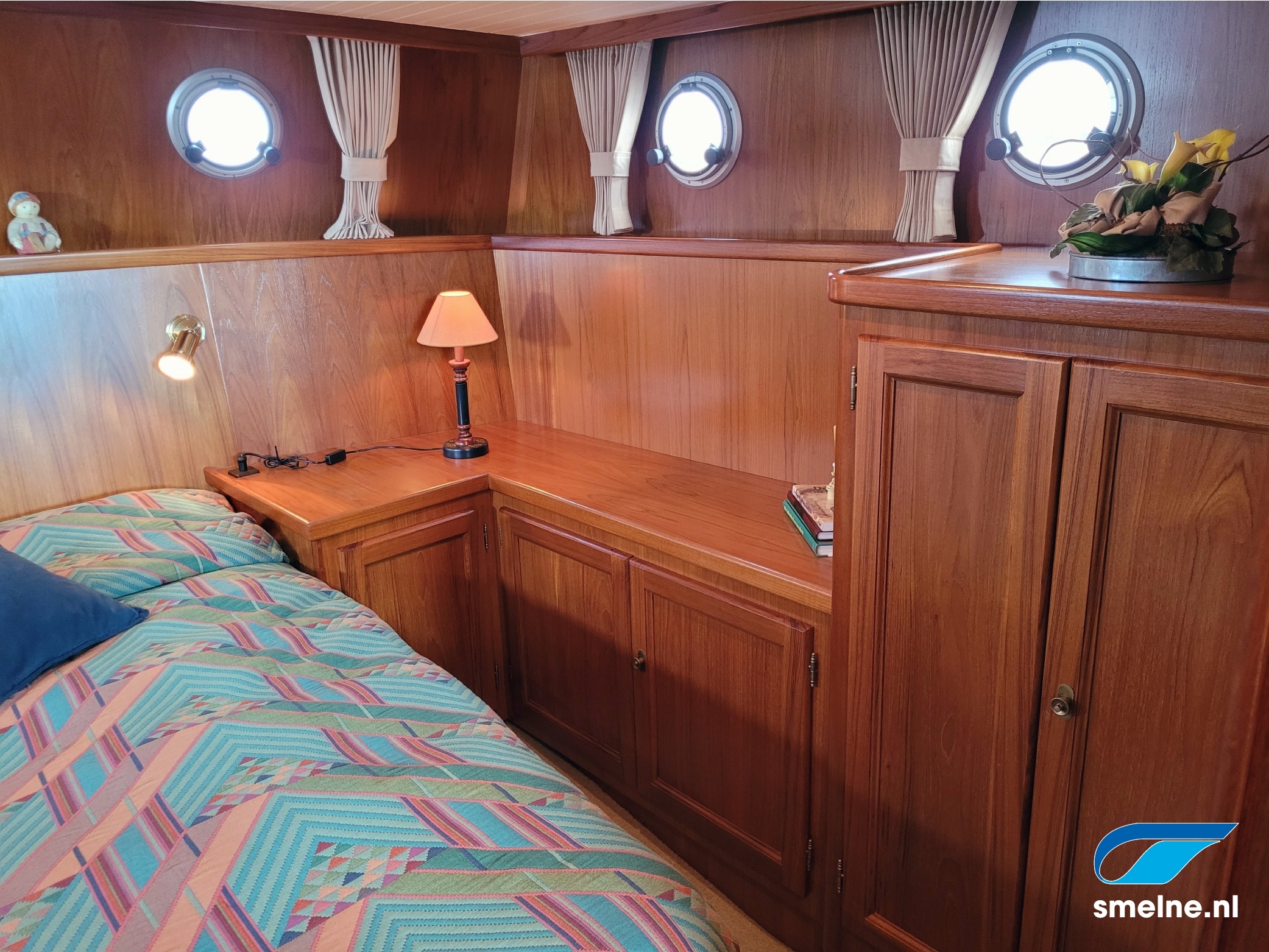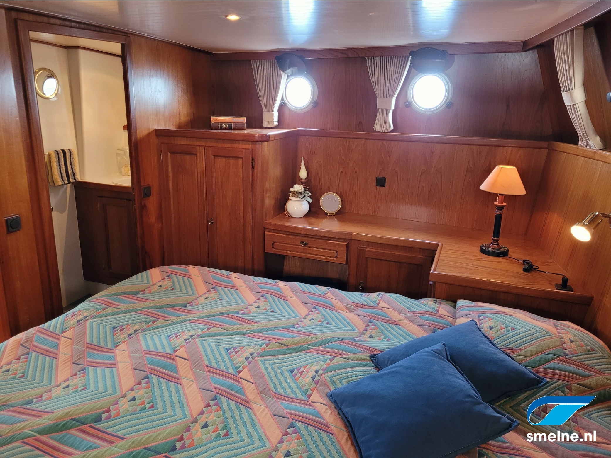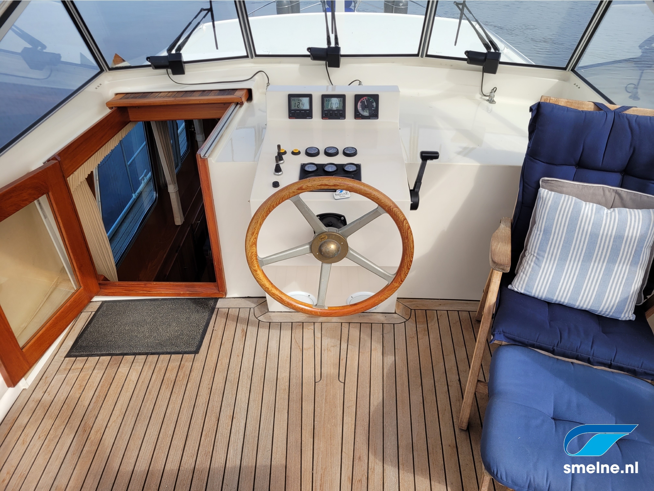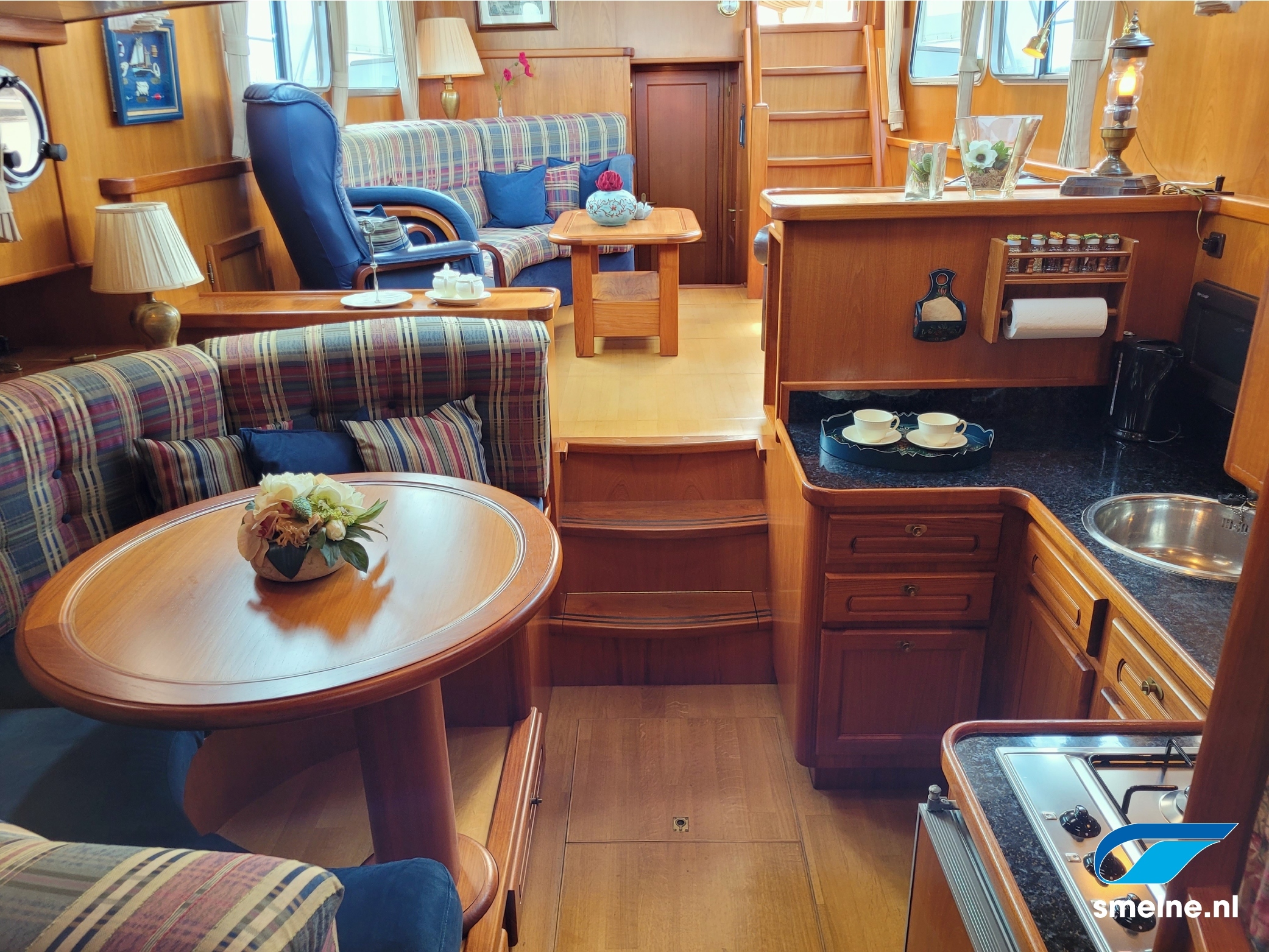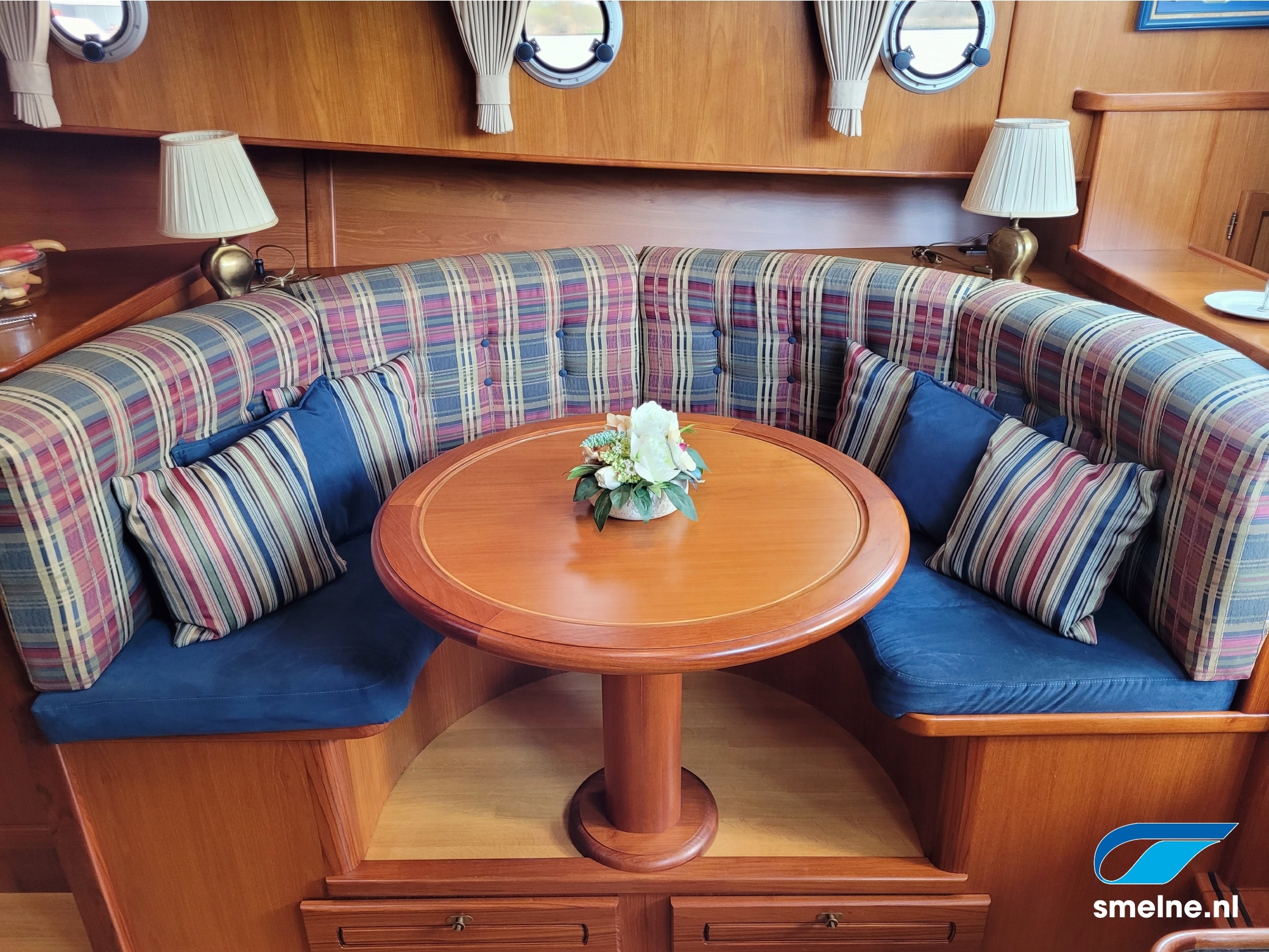 Het ruime achterdek is vanuit de brede gangboorden gemakkelijk toegankelijk en voorzien van vaste dekbank, midscheepse stuurstand met goed uitzicht rondom en achteringang naar de salon. De salon is ingedeeld met een kastenwand met daartegenover een hoek-zitbank zodat er ook nog ruimte is voor twee comfortabele fauteuils. In open verbinding met de salon is de kombuis die ingedeeld is met keuken met daartegenover een halfronde dinette. In het voorschip is een dubbel bed en kastruimte. In het achterschip is een ruime toiletruimte, de royale eigenaarshut met doucheruimte ensuite en veel kastruimte.