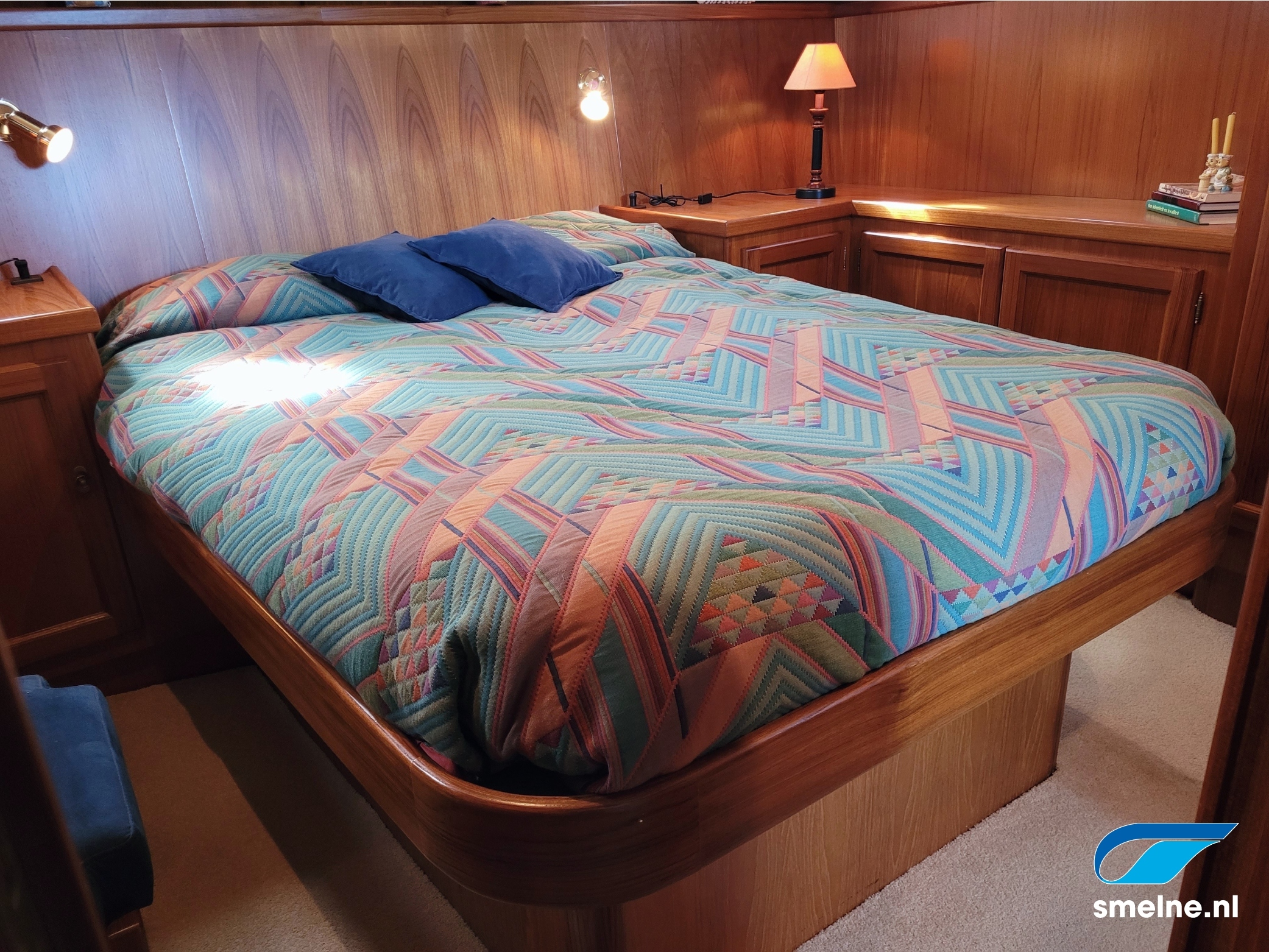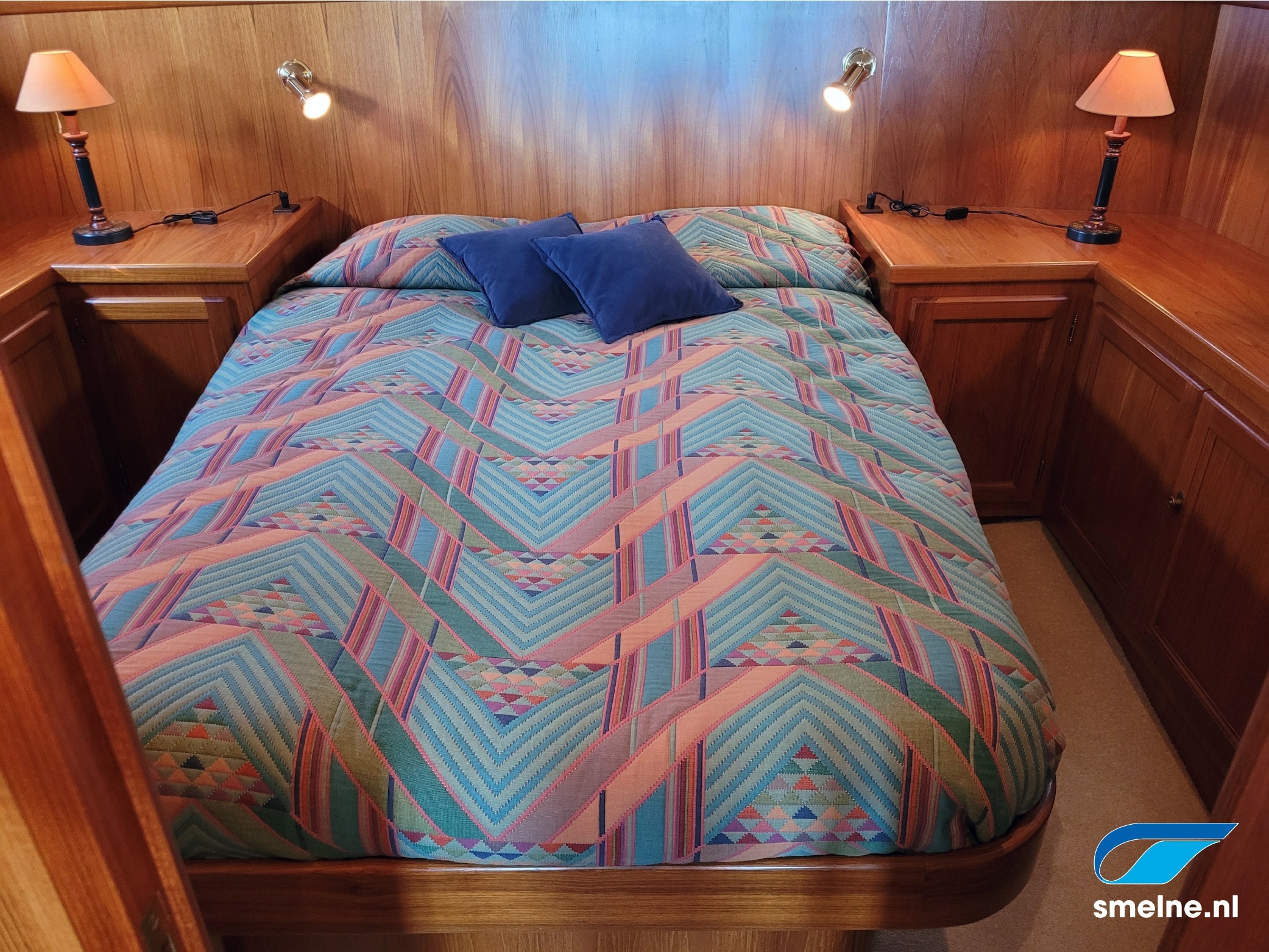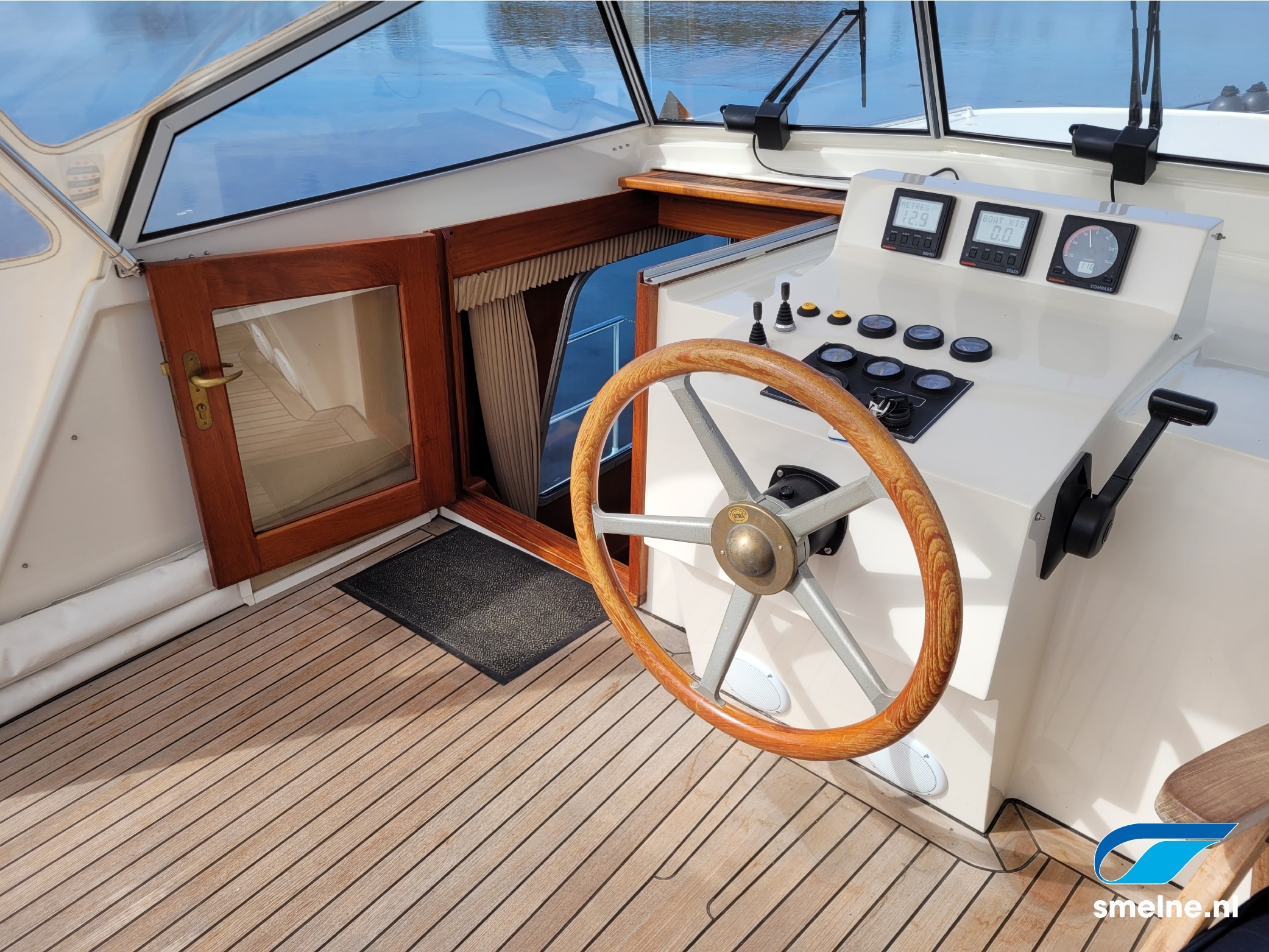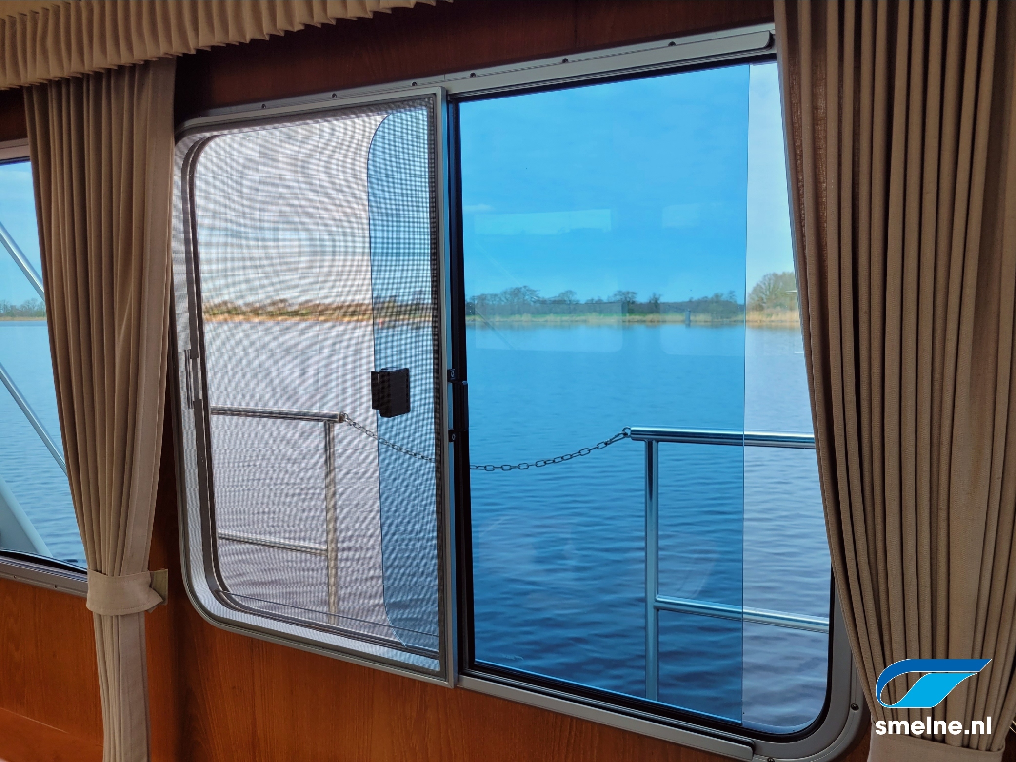 Het ruime achterdek is vanuit de brede gangboorden gemakkelijk toegankelijk en voorzien van vaste dekbank, midscheepse stuurstand met goed uitzicht rondom en achteringang naar de salon. De salon is ingedeeld met een kastenwand met daartegenover een hoek-zitbank zodat er ook nog ruimte is voor twee comfortabele fauteuils. In open verbinding met de salon is de kombuis die ingedeeld is met keuken met daartegenover een halfronde dinette. In het voorschip is een dubbel bed en kastruimte. In het achterschip is een ruime toiletruimte, de royale eigenaarshut met doucheruimte ensuite en veel kastruimte.