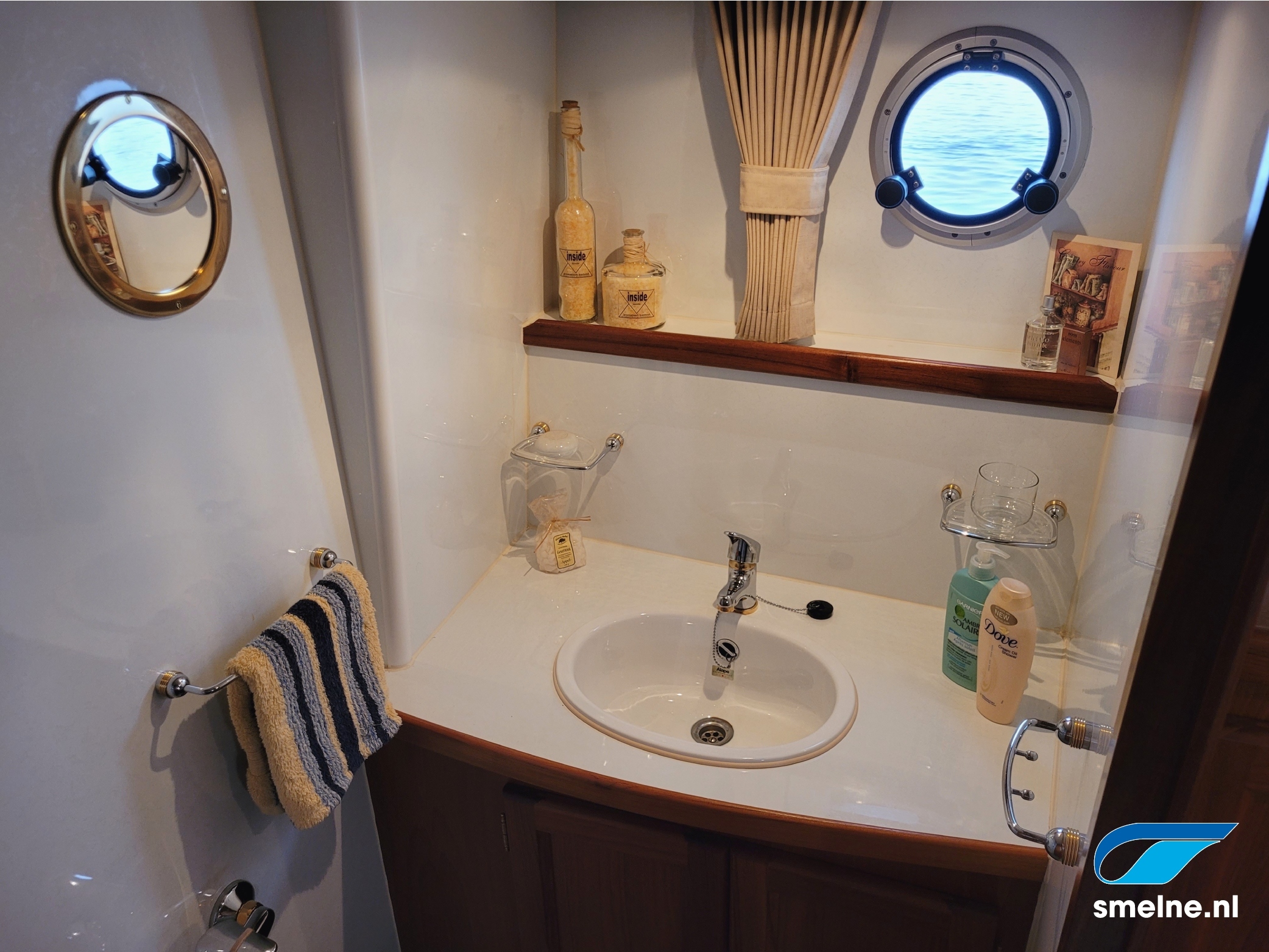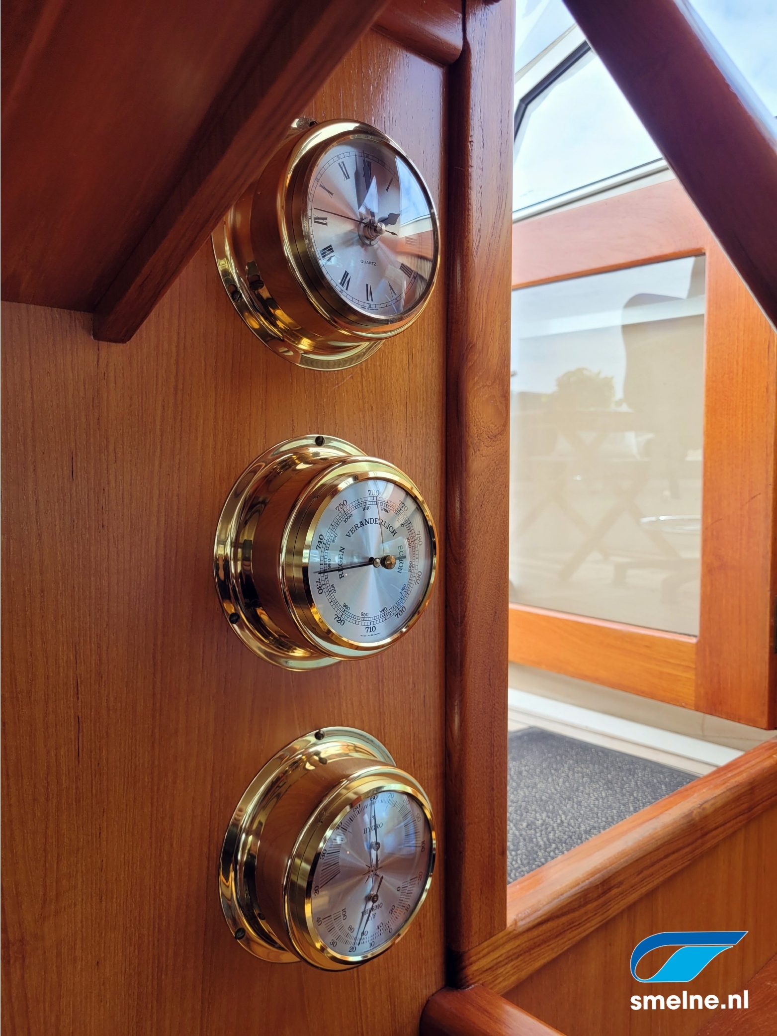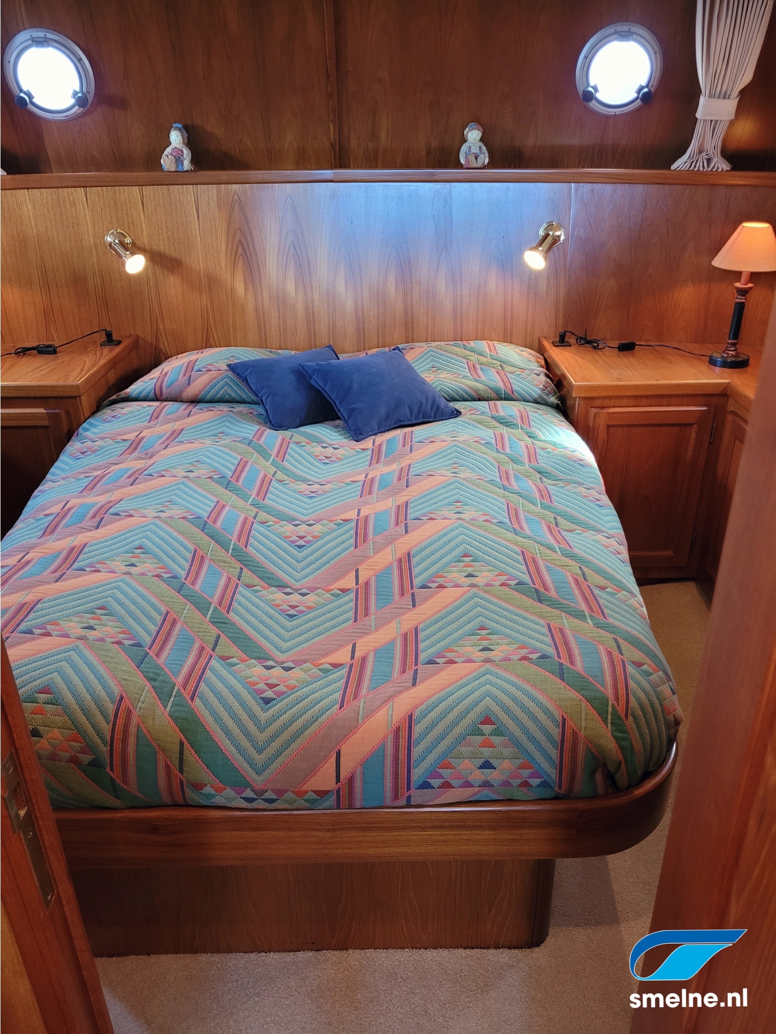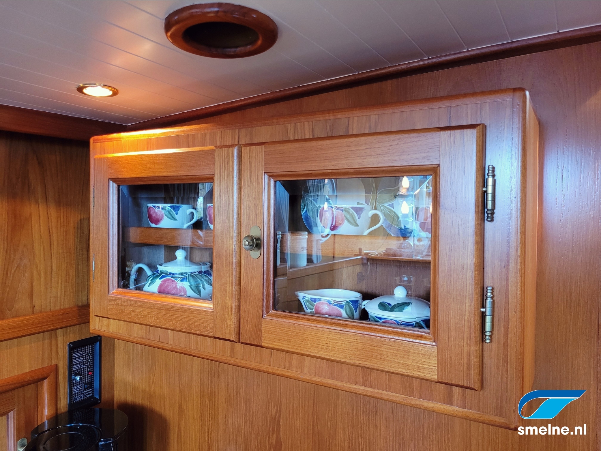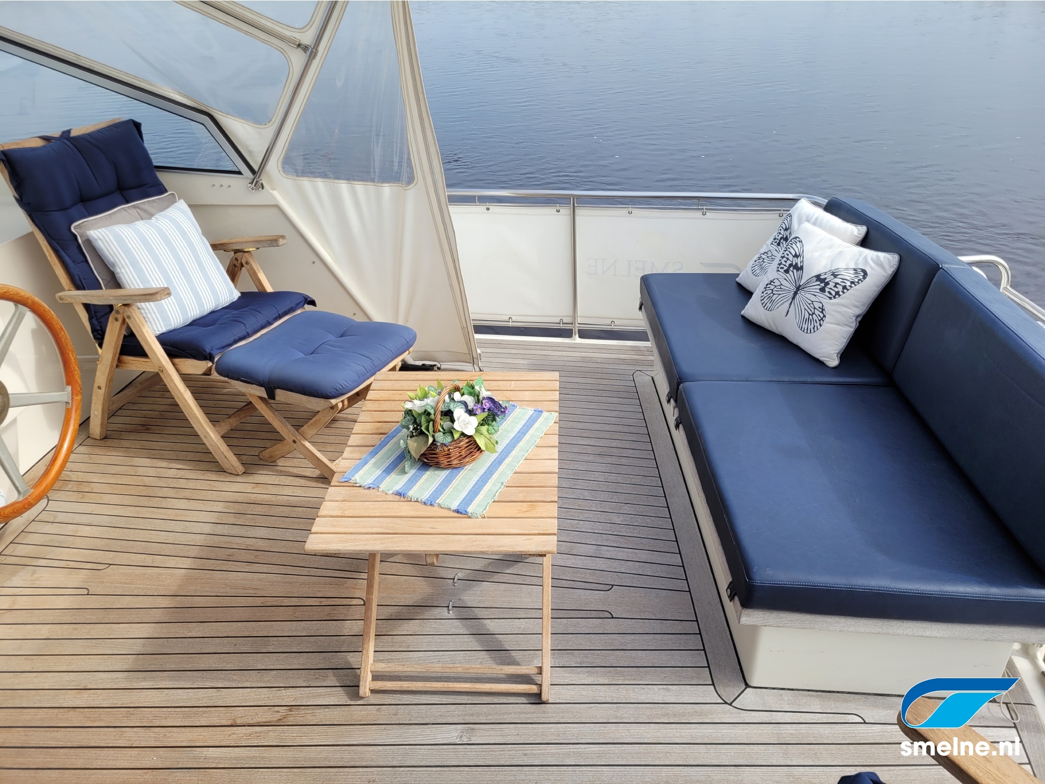 Het ruime achterdek is vanuit de brede gangboorden gemakkelijk toegankelijk en voorzien van vaste dekbank, midscheepse stuurstand met goed uitzicht rondom en achteringang naar de salon. De salon is ingedeeld met een kastenwand met daartegenover een hoek-zitbank zodat er ook nog ruimte is voor twee comfortabele fauteuils. In open verbinding met de salon is de kombuis die ingedeeld is met keuken met daartegenover een halfronde dinette. In het voorschip is een dubbel bed en kastruimte. In het achterschip is een ruime toiletruimte, de royale eigenaarshut met doucheruimte ensuite en veel kastruimte.