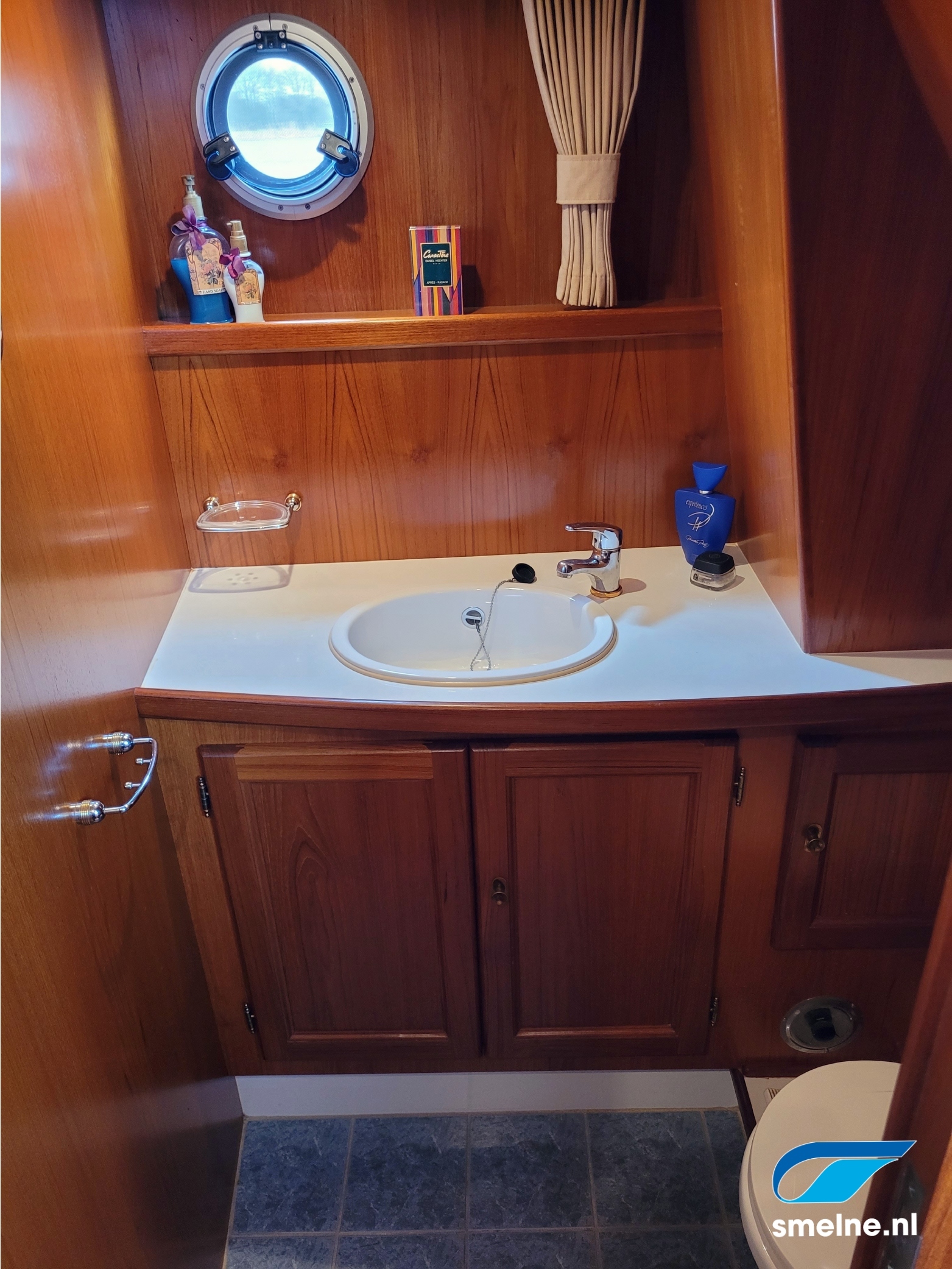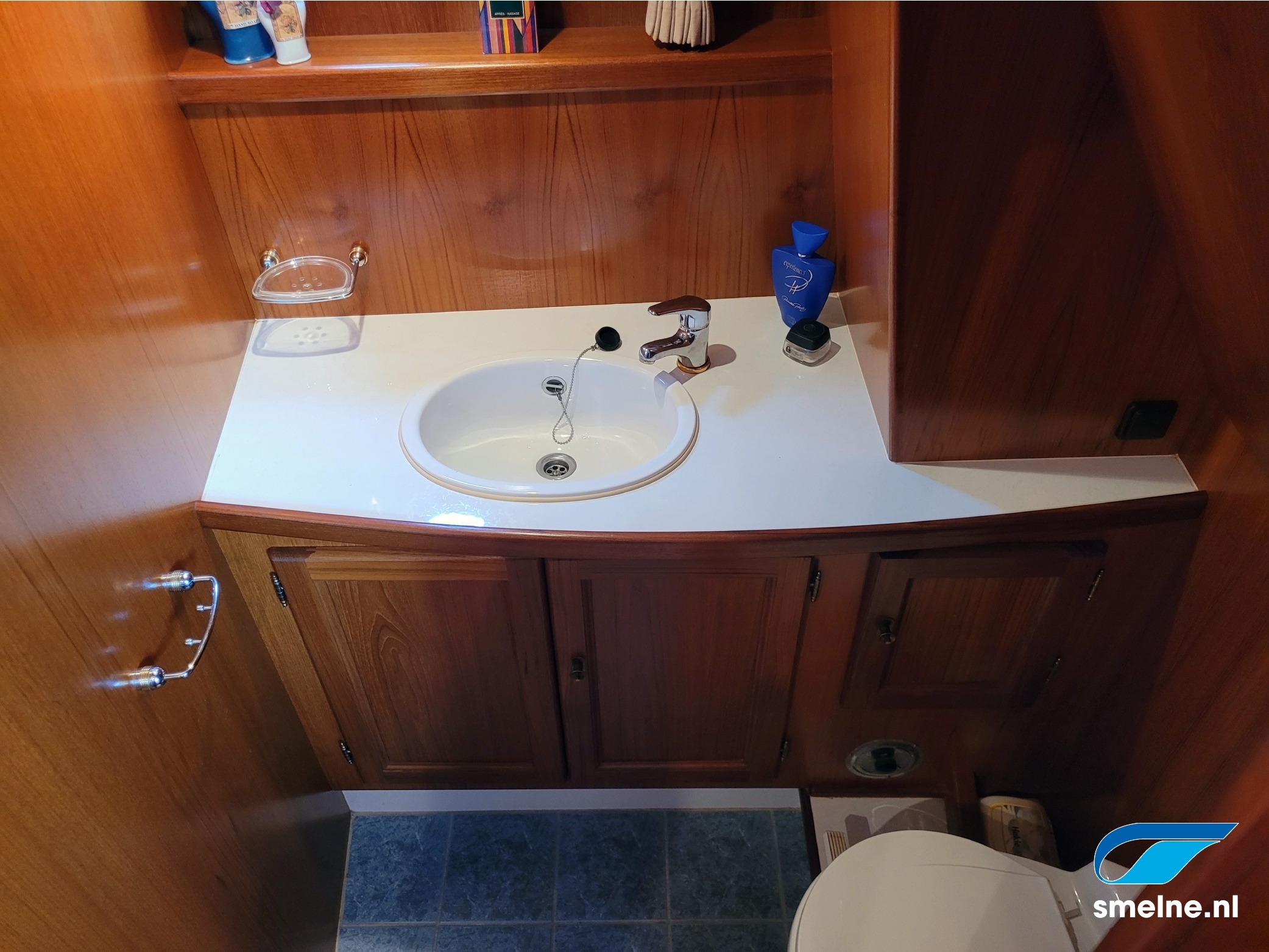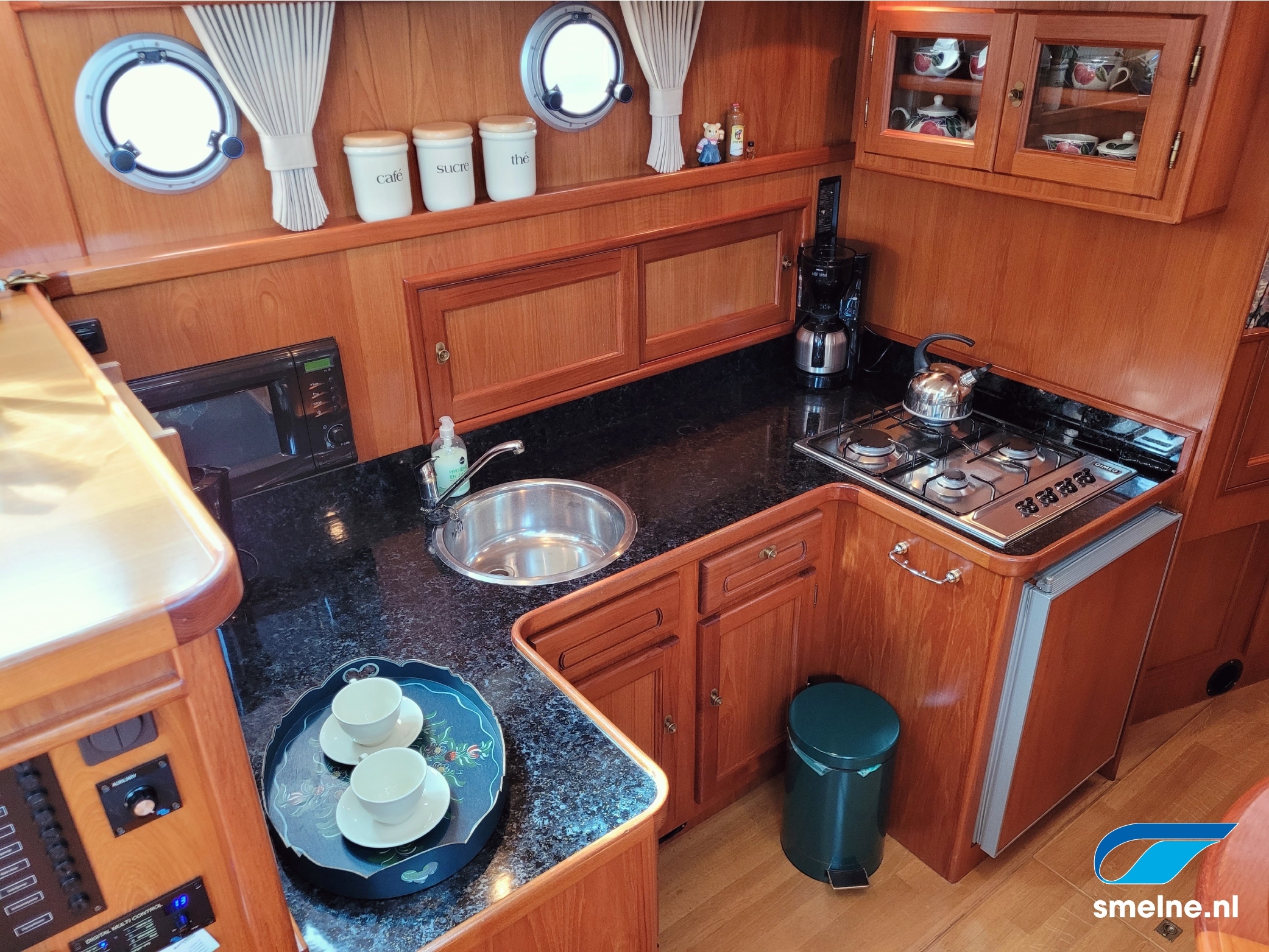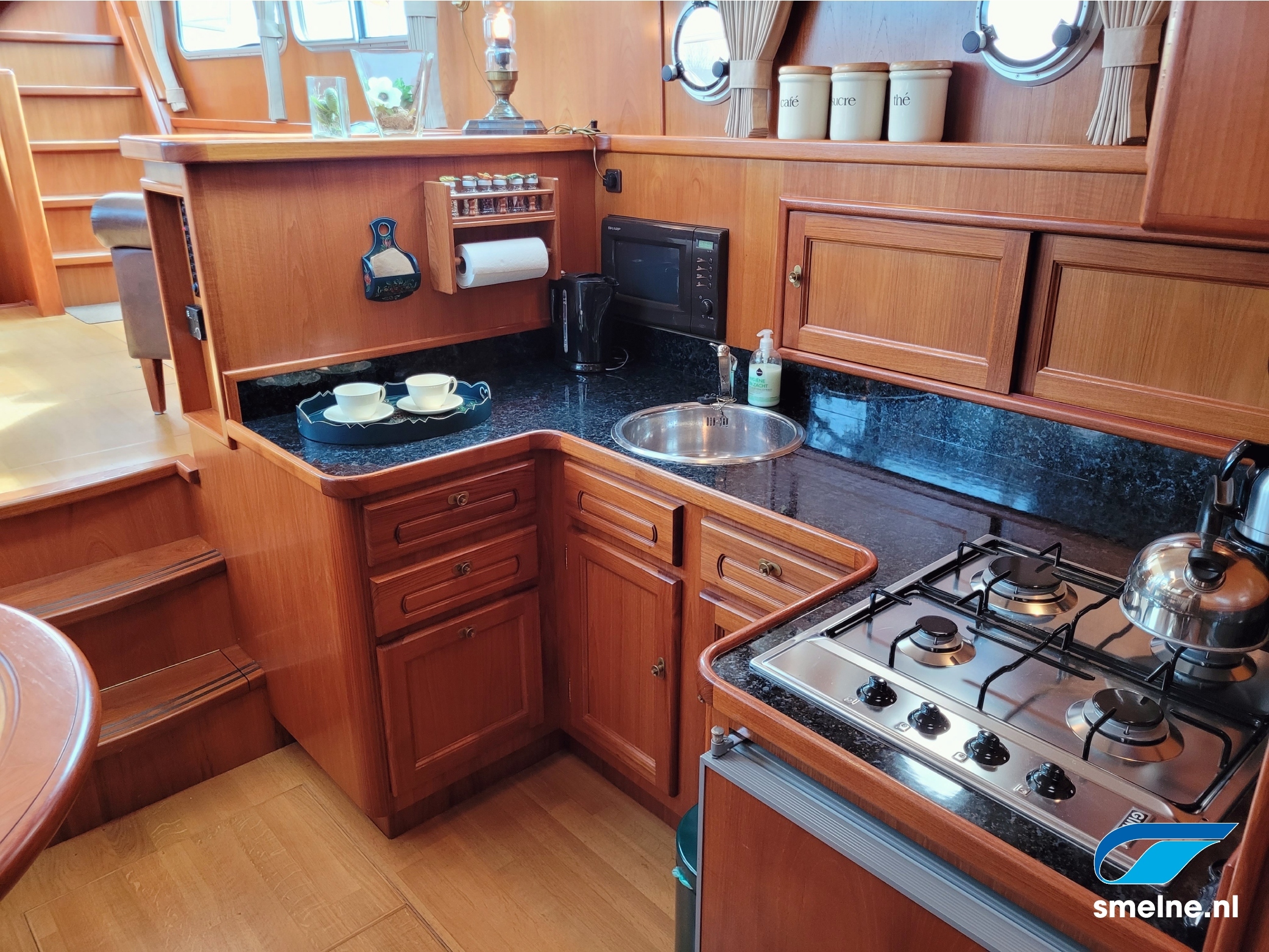 Het ruime achterdek is vanuit de brede gangboorden gemakkelijk toegankelijk en voorzien van vaste dekbank, midscheepse stuurstand met goed uitzicht rondom en achteringang naar de salon. De salon is ingedeeld met een kastenwand met daartegenover een hoek-zitbank zodat er ook nog ruimte is voor twee comfortabele fauteuils. In open verbinding met de salon is de kombuis die ingedeeld is met keuken met daartegenover een halfronde dinette. In het voorschip is een dubbel bed en kastruimte. In het achterschip is een ruime toiletruimte, de royale eigenaarshut met doucheruimte ensuite en veel kastruimte.