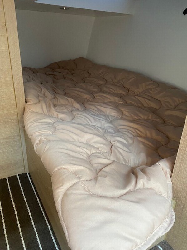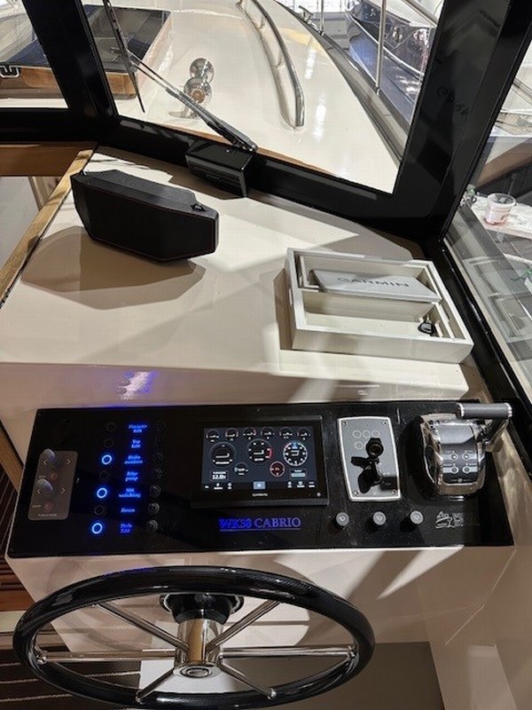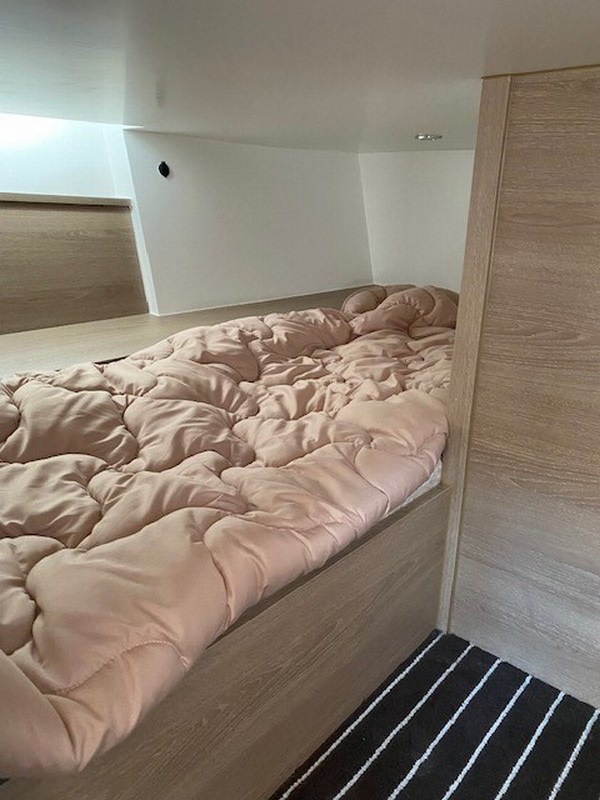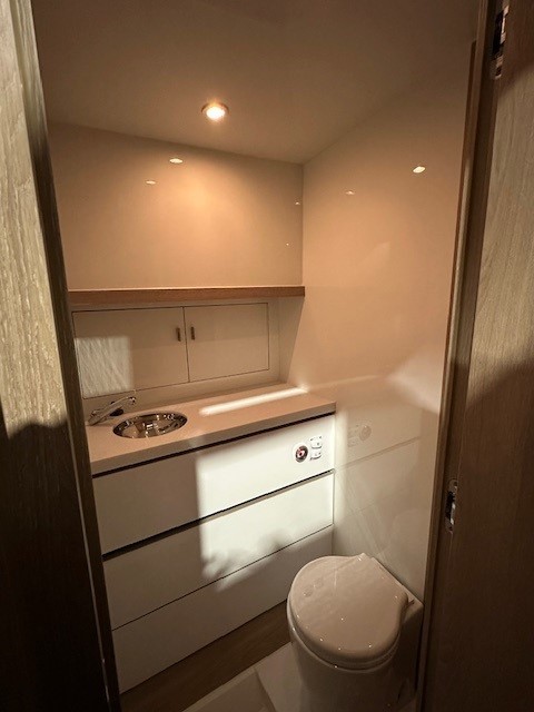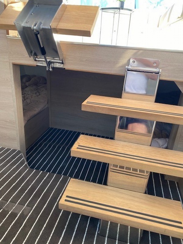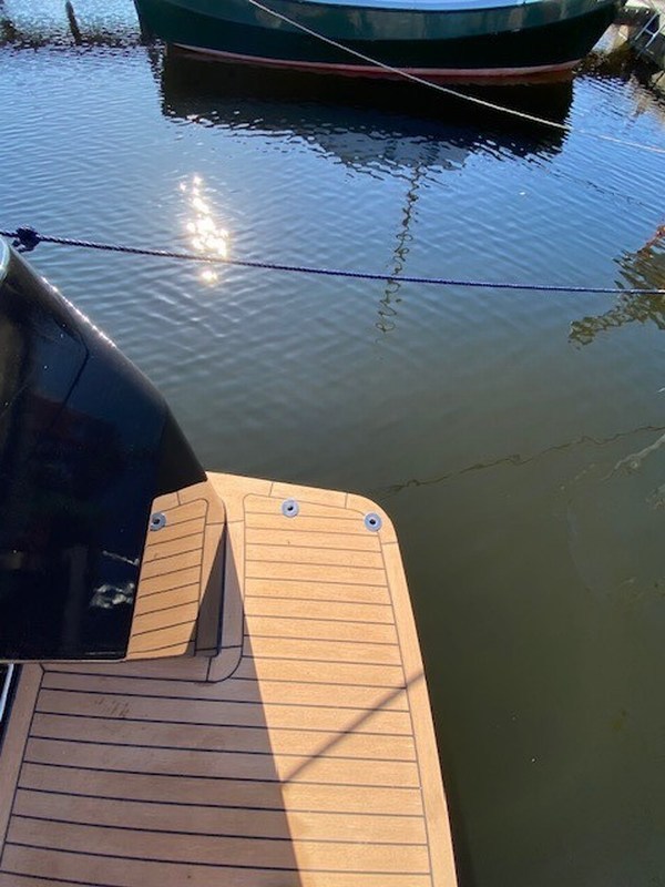 stijlvol "open" interieur ontworpen door Klein Design, licht interieur met goede lichtinval, grote open kuip met comfortabele zit en doorgang naar het zwemplateau.Het zwemplateau is bekleed met flexiteak.Onder het achterdek een hut met twee slaapplaatsen, in de salon een grote ruime kombuis met koelkast, wijnkoeler, wasbak met warm- en koud stromend water met hydrofoor en boiler. Wallas diesel kooktoestel, toilet ruimte met elektrisch toilet en een aparte natte cel met douche. Voorin een ruime hut met een 2 persoons bed.