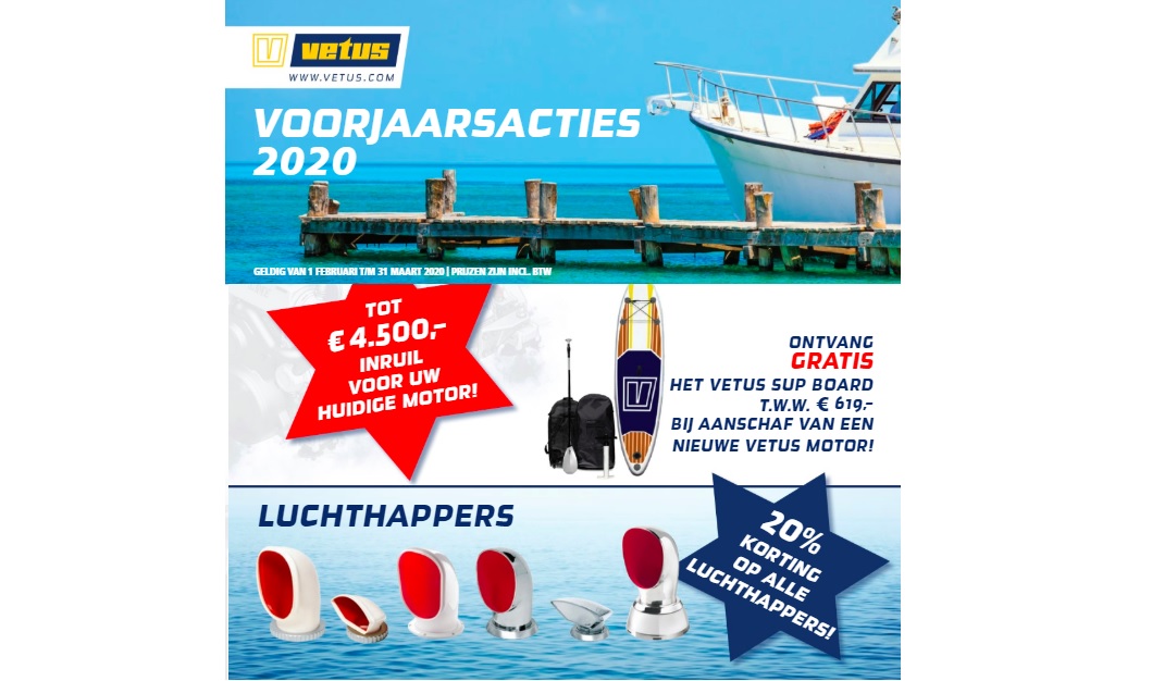 Om het nieuwe watersportseizoen goed te beginnen, heeft Vetus een aantal mooie voorjaarsaanbiedingen. De acties gelden tot en met 31 maart 2020 en zolang de voorraad strekt.